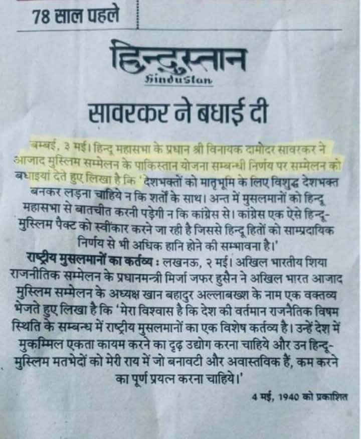 इन्हीं के विचार जनक सावरकर ही तो थे, जिन्होंने दो राष्ट्र बनाने का विचार दिया था और उसे हासिल करने का संकल्प साधा था। मार्च 1940 में लाहौर में हुए मुस्लिम लीग के सम्मेलन में पाकिस्तान बनाए जाने का प्रस्ताव रखते और उसे पारित करवाते समय, जिन्ना ने अपने दो-राष्ट्र सिद्धांत के पक्ष में सावरकर का ही हवाला दिया था। जिन्ना द्वारा दिए गए इस महत्व से सावरकर इतने प्रमुदित हुए थे कि उन्होंने मुस्लिम लीग के इस फैसले पर बाकायदा बधाई सन्देश भेजा था। इसके बाद तो जिन्ना राग उनके भाषण का हिस्सा बन गया ; लगभग हर सभा और सम्मेलन में दोहराते रहे कि “मेरा जिन्ना के द्वि-राष्ट्र के सिद्धांत से कोई झगड़ा नहीं है। हम हिंदू लोग अपने आप में एक राष्ट्र हैं और यह एक ऐतिहासिक तथ्य है कि हिंदू और मुसलमान दो राष्ट्र हैं।“