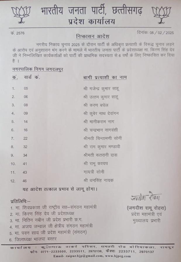 जगदलपुर। नगर पालिक निगम जगदलपुर में भारतीय जनता पार्टी के अधिकृत प्रत्याशियों के खिलाफ निर्दलीय के तौर पर चुनाव लड़ रहे पार्टी के 12 सदस्यों को भाजपा की प्राथमिक सदस्यता से 6 वर्षों के लिए निष्काषित कर दिया गया है। उक्ताश्य की जानकारी देते हुए भारतीय जनता पार्टी के बस्तर जिलाध्यक्ष वेदप्रकाश पांडे ने बताया कि भारतीय जनता पार्टी छत्तीसगढ़ प्रदेश इकाई द्वारा गजेंद्र कुमार साहू, उत्तम कुमार साहू, करण बघेल, कुबेरनाथ देवांगन, मानिक राम नाग, चंद्रभान नागवंशी, चिंतामणि सोनी, रामकुमार मंडावी, रूपरानी दास, रामू कश्यप, गायत्री सोनी, धनसिंह नायक को भाजपा पार्षद प्रत्याशियों के विरुद्ध चुनाव लड़ने पर निष्कासित करने की कार्रवाई की गई है।