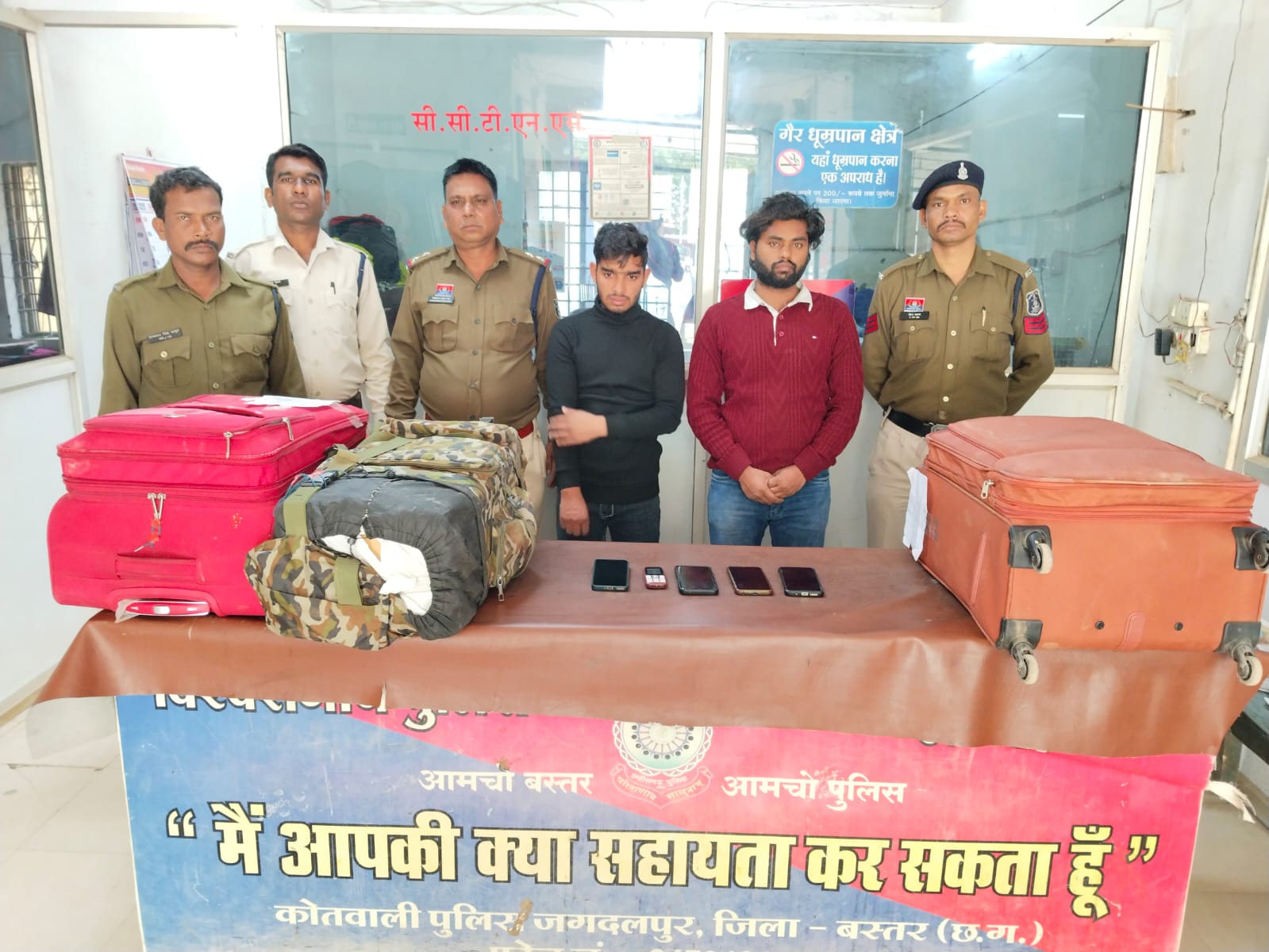 ज्ञात हो कि थाना सिटी कोतवाली जगदलपुर को सूचना मिली थी कि दो व्यक्ति दो ट्राली बैग एवं पिट्ठू बैग में गांजा रखकर लालबाग चौक पर बस का इंतजार कर रहे हैं। सूचना पर पुलिस अधीक्षक शलभ कुमार सिन्हा के मार्गदर्शन में अतिरिक्त पुलिस अधीक्षक माहेश्वर नाग के मार्गदर्शन एवं नगर पुलिस अधीक्षक आकाश श्रीश्रीमाल के पर्यवेक्षण में थाना प्रभारी सिटी कोतवाली शिवानंद सिंह के नेतृत्व में टीम गठित कर कार्रवाई हेतु टीम को रवाना किया गया। टीम द्वारा लालबाग आमागुडा चौक के आसपास घेराबंदी कर संदिग्ध दो व्यक्तियों को हिरासत में लेकर पूछताछ की गई। आरोपियों ने अपना नाम सैफअली राउ निवासी उत्तराखंड एवं जिशान अहमद निवासी उत्तरप्रदेश बताया। उनके तीनो बैग से गांजा मिला। उडीसा से गांजा लाकर उत्तराखंड व उत्तरप्रदेश ले जाने की बात कबूल की। आरोपियों एक नथिग कपंनी का मोबाइल फोन, एक रियलमी कंपनी का मोबाईल फोन, एक सेमसंग कंपनी का मोबाईल, एक रियलमी कंपनी का मोबाईलएवं एक पियर कंपनी का मोबाईल फोन, आधार कार्ड, पेन कार्ड, एसबीआई एटीएम कार्ड मिले। आरोपियों से कुल 78.106 किलोग्राम गांजा बरामद हुआ है, जिसकी अनुमानित कीमती 7 लाख 80 हजार रूपए है।आरोपियों के खिलाफ थाना सिटी कोतवाली में एनडीपीएस एक्ट के तहत प्रकरण पंजीबद्ध कर जांच में लिया गया है। मामले का भंडाफोड़ करने में निरीक्षक शिवानंद सिंह, सुरेश जांगड़े, उप निरीक्षक प्रमोद सिंह ठाकुर, लोकेश्वर नाग, एएसआई प्रमोद सिन्हा, प्रधान आरक्षक उमेश चंदेल, मोहन कश्यप, संजीव मिंज, हीरालाल भंडारी, आरक्षक युवराज सिंह ठाकुर, रवि सरदार, केशव चंद्रा, सायबर सेल के प्रधान आरक्षक लक्ष्मीनाथ बघेल व खेदू ठाकुर, आरक्षक भूपेंद्र नेताम व महेंद्र पटेल का योगदान रहा।