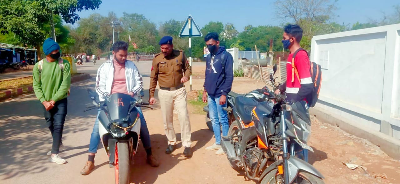 कवर्धा :- कबीरधाम पुलिस अधीक्षक डॉ. लाल उमेद सिंह के निर्देशन एवं अतिरिक्त पुलिस अधीक्षक मनीषा ठाकुर रावटे तथा उप. पुलिस अधीक्षक अजाक बी.आर. मंडावी के मार्गदर्शन में थाना कोतवाली प्रभारी निरीक्षक कपिल चंद्रा के द्वारा अभियान चलाया जा रहा है, जिसमें शहर के भीड़भाड़ वाले इलाके में स्टंट करते तथा तेज आवाज वाले साईलेंसर लगाकर दुपहिया वाहन चलाने वाले वाहन चालकों पर कोतवाली पुलिस के द्वारा कार्यवाही करने टीम गठित की गई है। इसी चेकिंग के दौरान तेज आवाज/ पटाखे की आवाज वाले साइलेंसर लगाकर वाहन चला रहे दुपहिया वाहन चालकों पर मोटर व्हीकल एक्ट के तहत कार्यवाही की गई है जिसमें (1) विक्की सिंह राजपूत उम्र 29 वर्ष वाहन क्रमांक सी.जी. 08 ए.डी. 3549, (2) राम किशन साहू वाहन क्रमांक सी.जी. 09 जे.के. 4096, (3) पलास चौहान उम्र 22 वर्ष वाहन क्रमांक सी.जी. 04 एल.डी. 1610, (4) विजय कश्यप, वाहन क्रमांक सी.जी. 09 -5193, (5) गौरव चंद्रसेन उम्र 19 वर्ष वाहन क्रमांक सी.जी. 09 जे.एल. 5674, (6) राहुल मरकाम उम्र 22 वर्ष वाहन क्रमांक सी.जी. 09 जे.एम. 3369,(7) अमन कोसले उम्र 19 वर्ष वाहन क्रमांक सी.जी. 04 एन.ए. 3366, (8) ए.डी. कुर्रे उम्र 21 वर्ष वाहन क्रमांक 09 जे.एल. 7222, उक्त वाहन चालकों के द्वारा तेज आवाज वाले साइलेंसर/ बिना नंबर के वाहन चलाते पाए गए जिनके विरुद्ध मोटर व्हीकल एक्ट के तहत चालानी कार्यवाही कर 6400/ रुपये का सामान शुल्क वसूल किया गया।