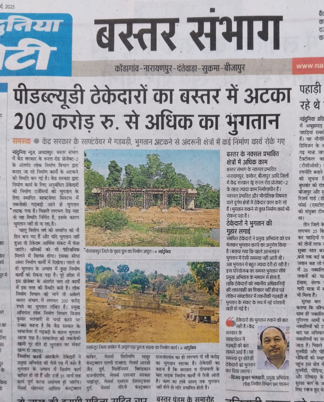 जगदलपुर। खबरों ने बस्तर संभाग को बड़ी राहत पहुंचाई है। बस्तर संभाग में अटके पड़े अरबों की लागत के पुल, पुलिया और सड़कों के निर्माण में अब गति आ जाएगी। लोक निर्माण विभाग के ठेकेदारों को भुगतान शुरू हो गया है और लगभग 80 प्रतिशत राशि का भुगतान वित्तीय वर्ष समाप्त होने से पहले हो जाएगा। प्रभावित क्षेत्रों के ग्रामीणों और ठेकेदारों ने इसके लिए मीडिया और विभाग के इंजीनियर इन चीफ वीके भतपहरी का आभार माना है।