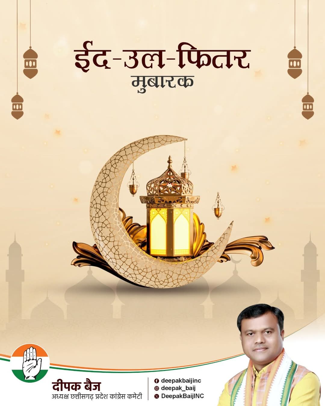 जगदलपुर। प्रदेश कांग्रेस अध्यक्ष दीपक बैज ने प्रदेश वासियों को चैत्र नवरात्रि, हिंदू नववर्ष, भगवान झूलेलाल जयंती चेट्रीचंड्र महोत्सव और ईद की शुभकामनाएं एवं यह मुबारकबाद दी है। श्री बैज ने कहा है कि ये पर्व सभी के जीवन में सुख, शांति और आपसी मोहब्बत की रोशनी फैलाए। आप और आपके परिवार के लिए तरक्की और खुशहाली का पैगाम लाए।