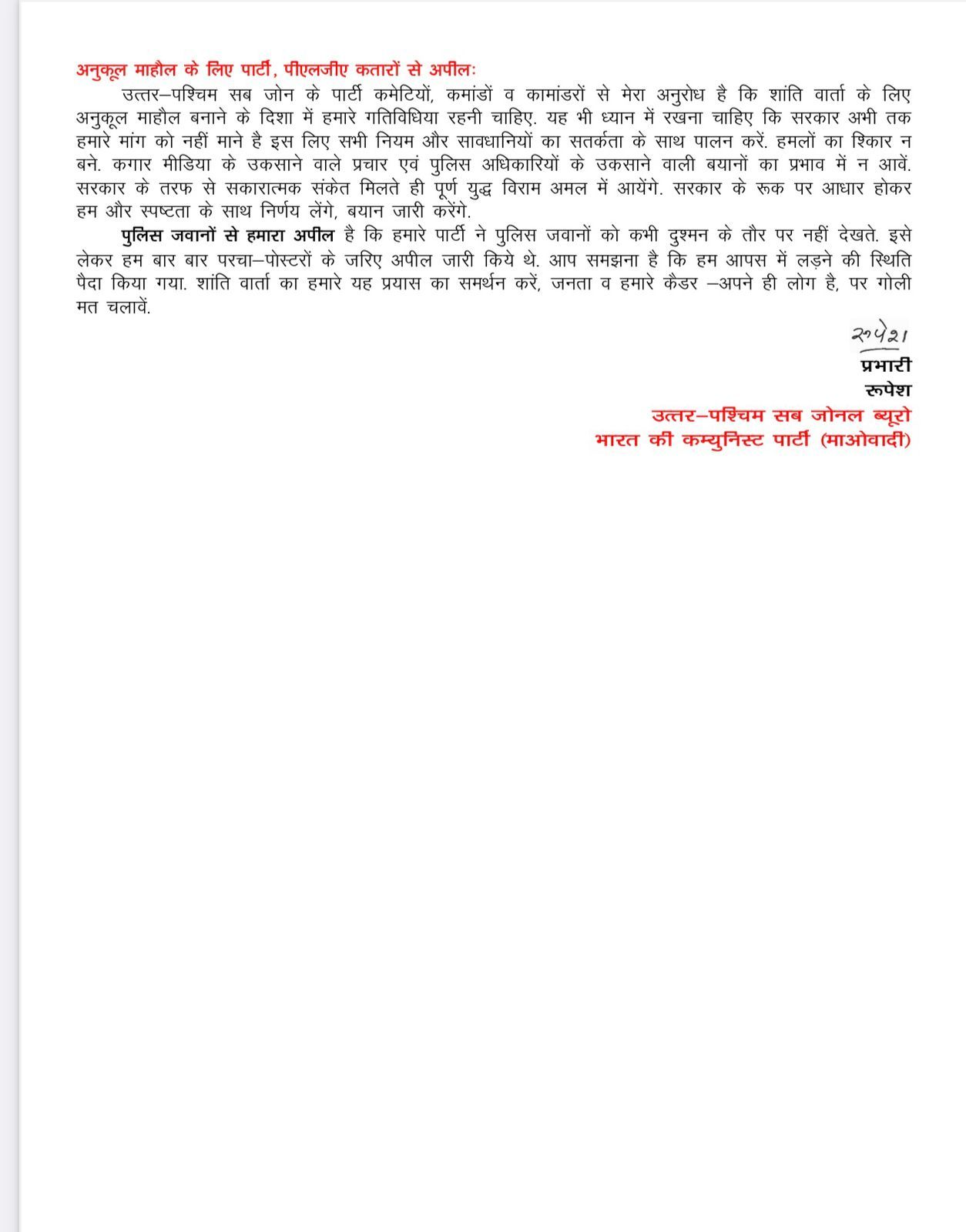 नक्सली संगठन के प्रवक्ता रुपेश ने कहा है कि हम शांति वार्ता के लिए तैयार हैं, मगर इसके लिए सरकार को अनुकूल माहौल तैयार करना होगा। इसके लिए सबसे पहले जरूरी है बस्तर में हो रहे हत्याकांड को रोकना। रुपेश ने कहा है कि इन हत्याकांडों से आम बस्तर वासी दहशत के साये में जीवन यापन करने मजबूर हैं। ग्रामीण पलायन कर रहे हैं। कथित हत्याकांड को लेकर रुपेश का उद्देश्य संभवतः मुठभेड़ों में मारे जा रहे नक्सलियों से है। रुपेश ने ने गृहमंत्री विजय शर्मा के बयान का हवाला देते हुए इंकार किया कि उनके संगठन की केंद्रीय कमेटी अनुकूल माहौल बनाने की मांग की है, लेकिन रुपेश ने यह भी कहा है कि बगैर अनुकूल माहौल बनाए शांति वार्ता हो नहीं सकती।रुपेश ने कहा है कि सरकार ने अभी जो रुख अपनाया हुआ है उसका और आत्मसमर्पण को समस्या का हल मानने का विरोध होना चाहिए।रुपेश ने कहा है कि शांति वार्ता की प्रक्रिया को लेकर नेतृत्वकर्ता साथियों और स्थानीय नेतृत्व की राय लेना जरूरी है, मगर सरकार की ओर से चलाए जा रहे अभियानों के बीच यह संभव नहीं होगा। इसलिए ऐसे अभियानों पर रोक लगनी चाहिए। इसका संकेत मिलते ही हम शांति वार्ता के लिए तैयार हो जाएंगे और उप मुख्यमंत्री एवं गृहमंत्री विजय शर्मा द्वारा उठाए गए मुद्दों को भी हम अपने एजेंडे में शामिल कर सकते हैं। रुपेश ने अनुकूल माहौल निर्माण हेतु जनवादी संगठनों, बुद्धिजीवियों और पत्रकारों से भी आगे आने की अपील नक्सली संगठन ने की है। बस्तर से शीर्ष नक्सली नेतृत्व के भाग जाने की बात को गलत बताते हुए रुपेश ने कहा है कि अगर ऐसा होता तो हमारी एसजेडसी मेंबर कामरेड रेणुका उर्फ चैते ने अस्वस्थता के बावजूद अपनी जान कुर्बान कर दी। जबकि उसके सैकड़ों मददगार हैं। रुपेश ने कहा कि हत्याकांडों को जायज ठहराने के लिए हमें विकास विरोधी करार दिया जाता है, जबकि हम स्कूल, सड़क, बिजली, पानी, चिकित्सा जैसी बुनियादी सुविधाएं बस्तर के लोगों को मिले इस बात के पक्षधर शुरू से रहे हैं। हम यहां के मूल निवासियों को जल जंगल जमीन के अधिकार से बेदखल किए जाने का विरोध करते हैं। अंत में रुपेश ने सब जोन की कमेटियों, कमांडोज और कमांडरों से शांति वार्ता के बारे में सजगता से काम करने को कहा है। रुपेश ने पुलिस जवानों को अपना ही भाई बताते हुए कहा है कि हमें आपस में लड़ाने की स्थिति पैदा की गई है, इसलिए शांति वार्ता के हमारे प्रयास का समर्थन करें।