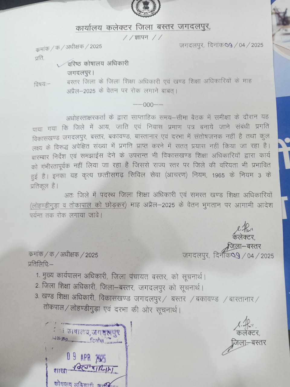 दरअसल साप्ताहिक समय सीमा बैठक में कलेक्टर जिले में चलाए जा रहे अभियानों और कार्यक्रमों की भी समीक्षा करते हैं। पिछली समय सीमा बैठक के दौरान कलेक्टर के संज्ञान में यह बात आई कि विद्यार्थियों के आय, जाति और निवास प्रमाण पत्र बनाने के मामले में विकासखंड जगदलपुर, बस्तर, बकावंड, बास्तनार और दरभा बहुत ही पीछे चल रहे हैं। जिला शिक्षा अधिकारी बीआर बघेल ने कलेक्टर हरिस एस. एवं जिला पंचायत सीईओ प्रतीक जैन के समक्ष पूरा ब्यौरा प्रस्तुत किया था। कलेक्टर और सीईओ की जानकारी में यह बात भी लाई गई कि बार बार निर्देश और समझाईश देने के बाद भी इन पांचों विकासखंडों के बीईओ ने मामले को गंभीरता से नहीं लिया और वे लापरवाही बरतते रहे। इसका परिणाम यह हुआ कि आय, जाति एवं निवास प्रमाण पत्र बनाने के मामले में राज्य स्तर पर बस्तर जिले की वरीयता बुरी तरह प्रभावित हो गई। कलेक्टर हरिस एस. ने इसे गंभीर लापरवाही और राज्य सिविल सेवा आचरण नियम 1965 के नियम 3 प्रतिकूल माना है। कलेक्टर ने जिला शिक्षा अधिकारी बीआर बघेल को आदेशित किया है कि जगदलपुर, बस्तर, बकावंड, बास्तनार और दरभा विकासखंडों के खंड शिक्षा अधिकारियों का अप्रैल माह का वेतन रोक दिया जाए। आय, जाति एवं निवास प्रमाण पत्र बनाने के मामले में सिर्फ तोकापाल और लोहंडीगुड़ा ब्लॉक के कार्य ही संतोषजनक पाए गए हैं।