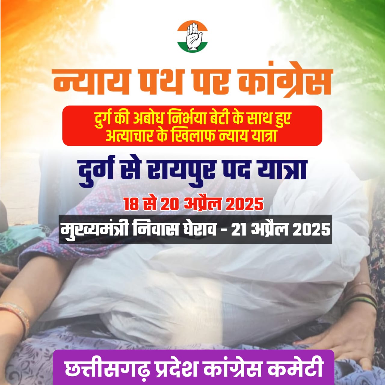 जगदलपुर। दुर्ग में एक अबोध बच्ची से दुराचार और उसकी हत्या के मामले को लेकर अब प्रदेश कांग्रेस अध्यक्ष दीपक बैज ने सड़क की लड़ाई शुरू कर दी है। इस मामले में कांग्रेस ने “न्याय पथ पर कांग्रेस” अभियान शुरू किया है। इसके तहत 18 अप्रैल को दुर्ग से दीपक बैज के नेतृत्व में कांग्रेस के लोग रायपुर तक पदयात्रा निकालेंगे और 21 अप्रैल को रायपुर पहुंच कर मुख्यमंत्री निवास का घेराव करेंगे।