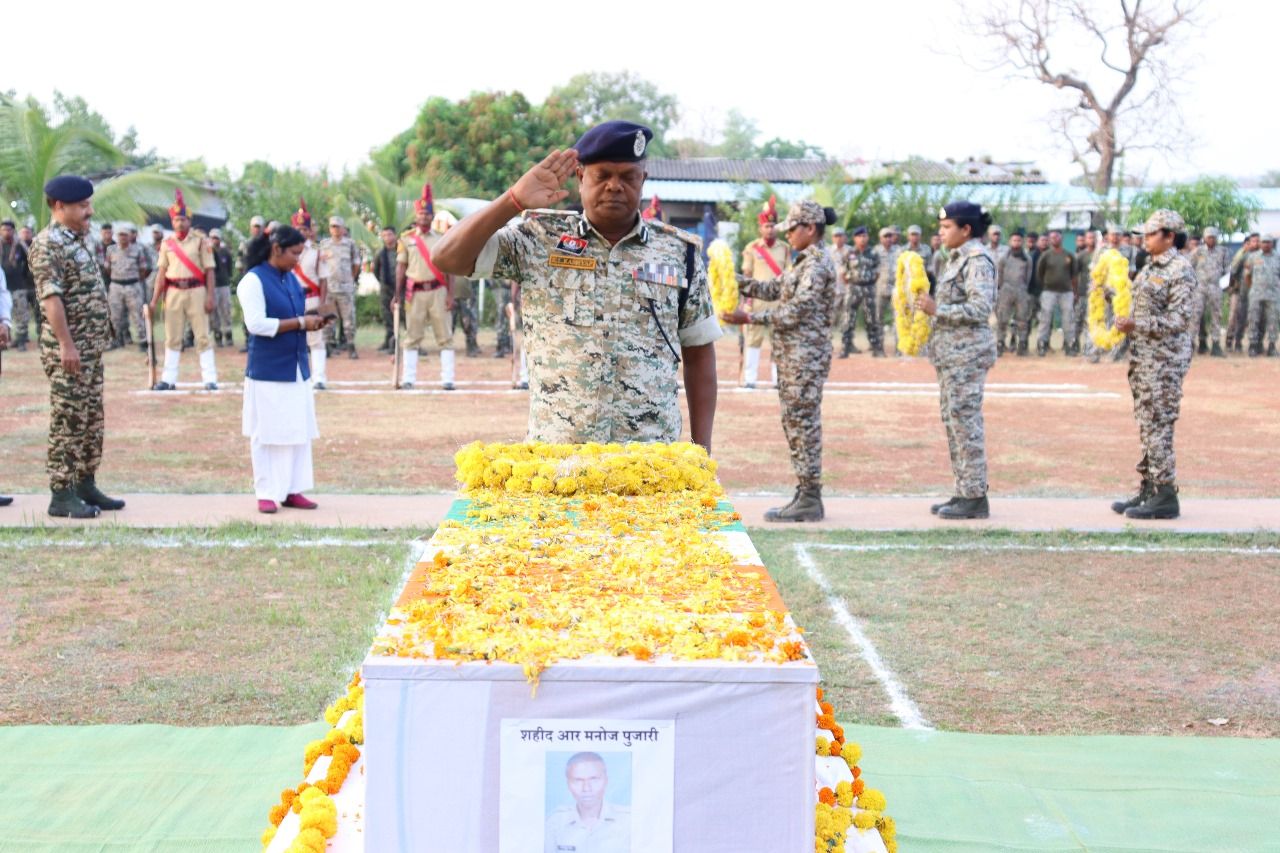 नई पुलिस लाइन बीजापुर में बलिदानी जवान मनोज पुजारी को पूर्व मंत्री महेश गागड़ा, जिला पंचायत अध्यक्ष जानकी कोसा, डीआईजी कमलोचन कश्यप, कलेक्टर संबित मिश्रा, एसपी जितेंद्र यादव सहित जिलों के जनप्रतिनिधियों व अन्य अधिकारियों ने श्रद्धांजलि अर्पित की। जवान के पार्थिव शरीर को उनके गृहग्राम बड़े तुमनार के लिए रवाना किया गया। इस दौरान भाजपा जिलाध्यक्ष घासीराम नाग, उप पुलिस महानिरीक्षक दंतेवाड़ा रेंज श्री कमलोचन कश्यप, उप महानिरीक्षक केरिपु ऑप्स बीजापुर सेक्टर देवेंद्र सिंह नेगी, अतिरिक्त पुलिस अधीक्षक मयंक गुर्जर, अतिरिक्त पुलिस अधीक्षक चंद्रकांत गवर्ना, अतिरिक्त पुलिस अधीक्षक ऑप्स युलैण्डन यार्क, उप पुलिस अधीक्षक घनश्याम कामड़े, उप पुलिस अधीक्षक डीआरजी विनीत साहू, शहीद जवान के परिजन, अन्य अधिकारी कर्मचारी, जनप्रतिनिधि उपस्थित रहे।