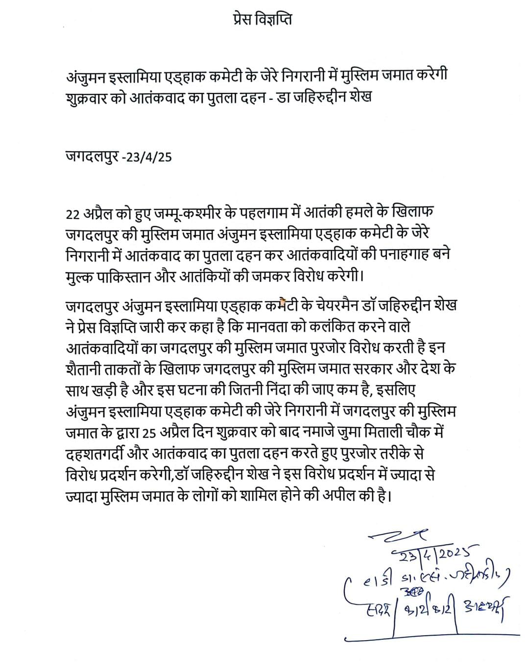 जगदलपुर अंजुमन इस्लामिया एड्हाक कमेटी के चेयरमैन डॉ जहीरुद्दीन शेख ने प्रेस विज्ञप्ति जारी कर कहा है कि मानवता को कलंकित करने वाले आतंकवादियों का जगदलपुर की मुस्लिम जमात पुरजोर विरोध करती है। इन शैतानी ताकतों के खिलाफ जगदलपुर की मुस्लिम जमात सरकार और देश के साथ खड़ी है और इस घटना की जितनी निंदा की जाए कम है। इसलिए अंजुमन इस्लामिया एड्हाक कमेटी की जेरे निगरानी में जगदलपुर की मुस्लिम जमात द्वारा 25 अप्रैल दिन शुक्रवार को बाद नमाजे जुमा मिताली चौक पर दहशतगर्दी और आतंकवाद का पुतला दहन करते हुए पुरजोर तरीके से विरोध प्रदर्शन किया जाएगा। डॉ जहीरुद्दीन शेख ने इस विरोध प्रदर्शन में ज्यादा से ज्यादा मुस्लिम जमात के लोगों को शामिल होने की अपील की है।