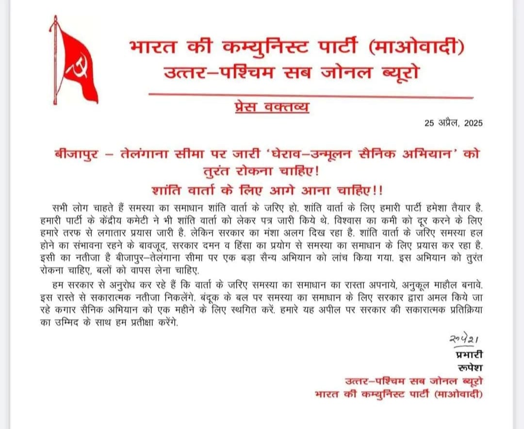 प्रतिबंधित नक्सली संगठन भारत की कम्युनिस्ट पार्टी (माओवादी) के उत्तर पश्चिम सब जोनल ब्यूरो के प्रभारी रुपेश ने आज एक पत्र जारी कर सरकार से फिर शांति वार्ता की गुहार लगाई है। इस पत्र में कहा गया है- हम लोग चाहते हैं कि समस्या का समाधान शांति वार्ता के जरिए हो, शांति वार्ता के लिए हमारी पार्टी हमेशा तैयार है। हमारी पार्टी की केंद्रीय कमेटी ने भी शांति वार्ता के लिए पत्र जारी किए थे। विश्वास की कमी को दूर करने के लिए हमारी तरफ से लगातार प्रयास जारी हैं, लेकिन सरकार की मंशा कुछ अलग दिख रही है। शांति वार्ता के जरिए समस्या हल होने की संभावना रहने के बावजूद सरकार दमन और हिंसा का प्रयोग कर समस्या का समाधान करने प्रयास कर रही है। इसी का नतीजा है कि तेलंगाना-बीजापुर सीमा पर बड़ा सैन्य अभियान लांच किया गया है। इस अभियान को तुरंत रोकना चाहिए और सुरक्षा बलों को वापस बुलाना चाहिए। रुपेश ने आगे लिखा है- हम सरकार से अनुरोध कर रहे हैं किवार्ता के जरिए समस्या के समाधान का रास्ता अपनाएं, अनुकूल माहौल बनाएं। इस रास्ते से ही नतीजे निकलेंगे। बंदूक के बल पर सरकार द्वारा चलाए जा रहे कगार सैन्य अभियान को एक माह के लिए बंद किया जाए। यह सरकार से हमारी अपील है। सरकार से सकारात्मक प्रतिक्रिया की उम्मीद है, हम प्रतीक्षा करेंगे। यह पत्र बताता है कि नक्सली अब किस हद तक दहशत के साये में जी रहे हैं। जिन नक्सलियों की बोली और भाषा बम, बारूद और गोली रही है और जिन्होंने दशकों तक बस्तर संभाग को अशांत कर रखा था, वही अब शांति की दुहाई दे रहे हैं, बंदूक के दम पर समस्या का समाधान न होने की बात कह रहे हैं। बात दरअसल यह है कि तेलंगाना-बीजापुर बॉर्डर पर सुरक्षा बलों ने तीन दिन से बड़ा ऑपरेशन चला रखा है। जमीनी वार के साथ ही आसमान से हेलीकाप्टर के जरिए भी नक्सली ठिकानों पर गोले दागे जा रहे हैं। इस ऑपरेशन में अब तक पांच नक्सलियों के मारे जाने और दर्जनों नक्सलियों के हताहत होने तथा भारी मात्रा में नक्सलियों के गोला बारूद और हथियारों के तबाह हो जाने की खबर है। सूत्र बताते हैं कि जिस जगह पर ऑपरेशन लॉन्चकिया गया है, वहां टॉप नक्सली लीडर हिड़मा और देवा भी थे, लेकिन उनके भाग निकलने की खबर है। रुपेश का यह पत्र उसी डर का नतीजा है। सुरक्षा बलों को फ्रीहैंड कर दिए जाने और सरकार का दवाब बढ़ने से नक्सली कुछ दिनों से लगातार शांति वार्ता की बात करने लगे हैं। लेकिन सरकार की ओर से अब निर्णायक लड़ाई लड़ने की तैयारी है अब नहीं सहिबो, निपटा के रहिबो की तर्ज पर कई हजार अर्ध सैनिक बल अब इस समस्याको जड़ से उखाड़ फेंकने की मुहिम में लगे हुए हैं। सूत्रों की मानें तो गृह मंत्री का इस दौरान बीजापुर कैंप कर जवानों की हौसला अफजाई करने की बात भी सामने आ रही है। उप 