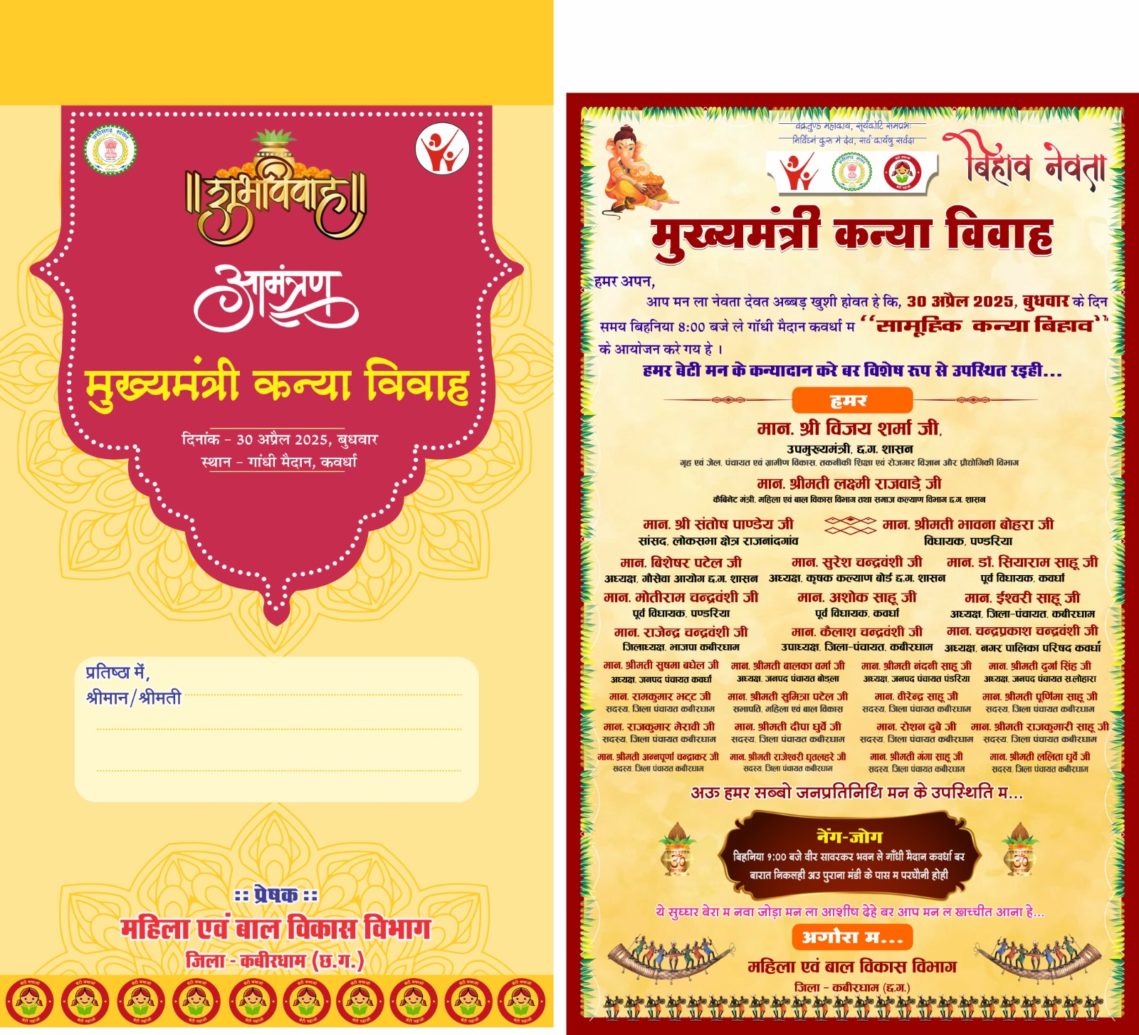 कवर्धा :- गांधी मैदान कवर्धा में 30 अप्रैल को राज्य शासन द्वारा संचालित मुख्यमंत्री कन्या विवाह योजना के तहत कबीरधाम जिले के 101 नवदंप्त जोड़े विवाह के शुभ बंधन में बंधेगे। मुख्यमंत्री कन्या विवाह कार्यक्रम में प्रदेश के उपमुख्यमंत्री श्री विजय शर्मा, महिला एवं बाल विकास मंत्री श्रीमती लक्ष्मी राजवाड़े, सांसद श्री संतोष पाण्डेय, पंडरिया विधायक श्रीमती भावना बोहरा, गौ सेवा आयोग के अध्यक्ष श्री बिशेसर पटेल, कृषक कल्याण बोर्ड के अध्यक्ष श्री सुरेश चंद्रवंशी, पूर्व विधायक डॉ. सियाराम साहू, श्री मोतिराम चंद्रवंशी, श्री अशोक साहू, जिला पंचायत अध्यक्ष श्री ईश्वरी साहू, श्री राजेन्द्र चंद्रवंशी, जिला पंचायत उपाध्यक्ष श्री कैलाश चंद्रवंशी, नगर पालिका अध्यक्ष श्री चंद्रप्रकाश चंद्रवंशी मुख्यअतिथि के तौर पर शामिल होंगे और नव दम्पत्तियों को आशीर्वाद प्रदान करेंगे।