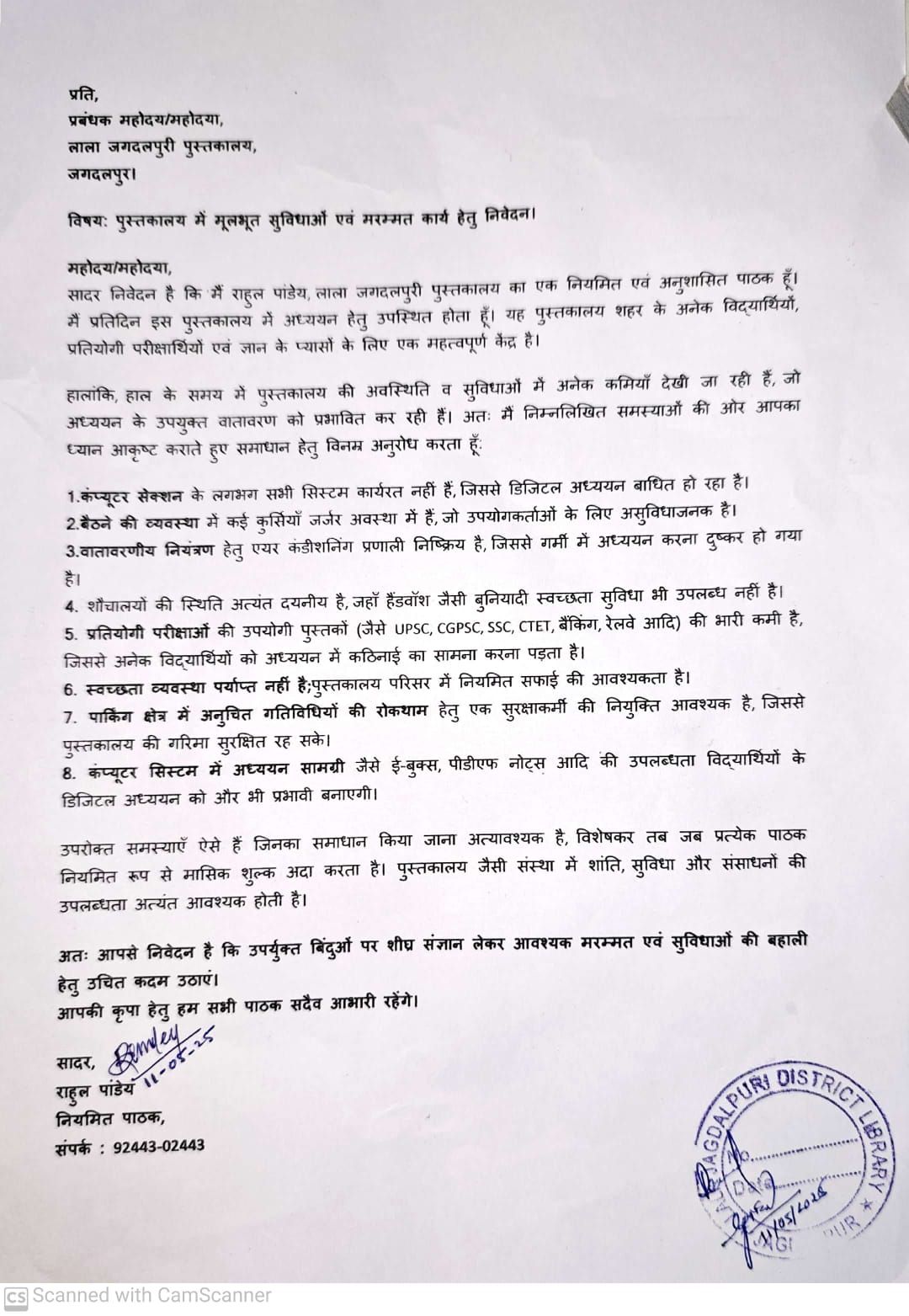 यह पहल पुस्तकालय के सक्रिय पाठक राहुल कुमार पांडे के नेतृत्व में की गई, जिनके साथ बड़ी संख्या में छात्र-छात्राएं और प्रतियोगी परीक्षार्थी उपस्थित थे।पाठकों ने पुस्तकालय की मौजूदा हालत पर गंभीर चिंता व्यक्त करते हुए बताया कि यहां कंप्यूटर सेक्शन लंबे समय से बंद है, जिससे डिजिटल पढ़ाई बाधित हो रही है। कुर्सियां टूटी हुई हैं, जिससे पाठकों को लगातार असुविधा का सामना करना पड़ता है। साथ ही गर्मी के इस मौसम में एयर कंडीशनिंग प्रणाली काम नहीं कर रही है, जिससे अध्ययन का वातावरण प्रभावित हो रहा है। पाठकों ने पुस्तकालय के शौचालयों की खराब स्थिति और वहां स्वच्छता की कमी को लेकर भी असंतोष जताया। उन्होंने कहा कि हैंडवॉश जैसी जरूरी सुविधा तक मौजूद नहीं है। इसके अलावा प्रतियोगी परीक्षाओं की तैयारी के लिए जरूरी किताबें भी पुस्तकालय में उपलब्ध नहीं हैं। सफाई व्यवस्था नियमित नहीं है और परिसर में अनुशासन व सुरक्षित वातावरण बनाए रखने के लिए कोई सुरक्षा प्रबंध नहीं है। प्रतिनिधियों ने सुझाव दिया कि कंप्यूटरों में ई-बुक्स और अन्य डिजिटल अध्ययन सामग्री उपलब्ध कराई जाए और सुरक्षा के लिए एक गार्ड की नियुक्ति की जाए ताकि पुस्तकालय का वातावरण शांत और सुरक्षित बना रहे। सभी पाठकों ने यह स्पष्ट किया कि जब वे नियमित रूप से मासिक शुल्क अदा करते हैं, तो पुस्तकालय की इतनी उपेक्षित स्थिति उचित नहीं है। यह पुस्तकालय पूरे बस्तर संभाग के लिए एक प्रमुख अध्ययन केंद्र है और इसकी उपेक्षा पूरे क्षेत्र के विद्यार्थियों के भविष्य को प्रभावित कर सकती है। इस प्रयास में राहुल कुमार पांडे के साथ रोहन कुमार, हरीश साहू, शुभम दुबे, जय बंजारे, कर्तव्य आचार्य, मनीष कुमार और मिंटू पांडेय सहित अनेक पाठक उपस्थित रहे। उन्होंने मांग की कि प्रशासन इन समस्याओं का शीघ्र समाधान करे।