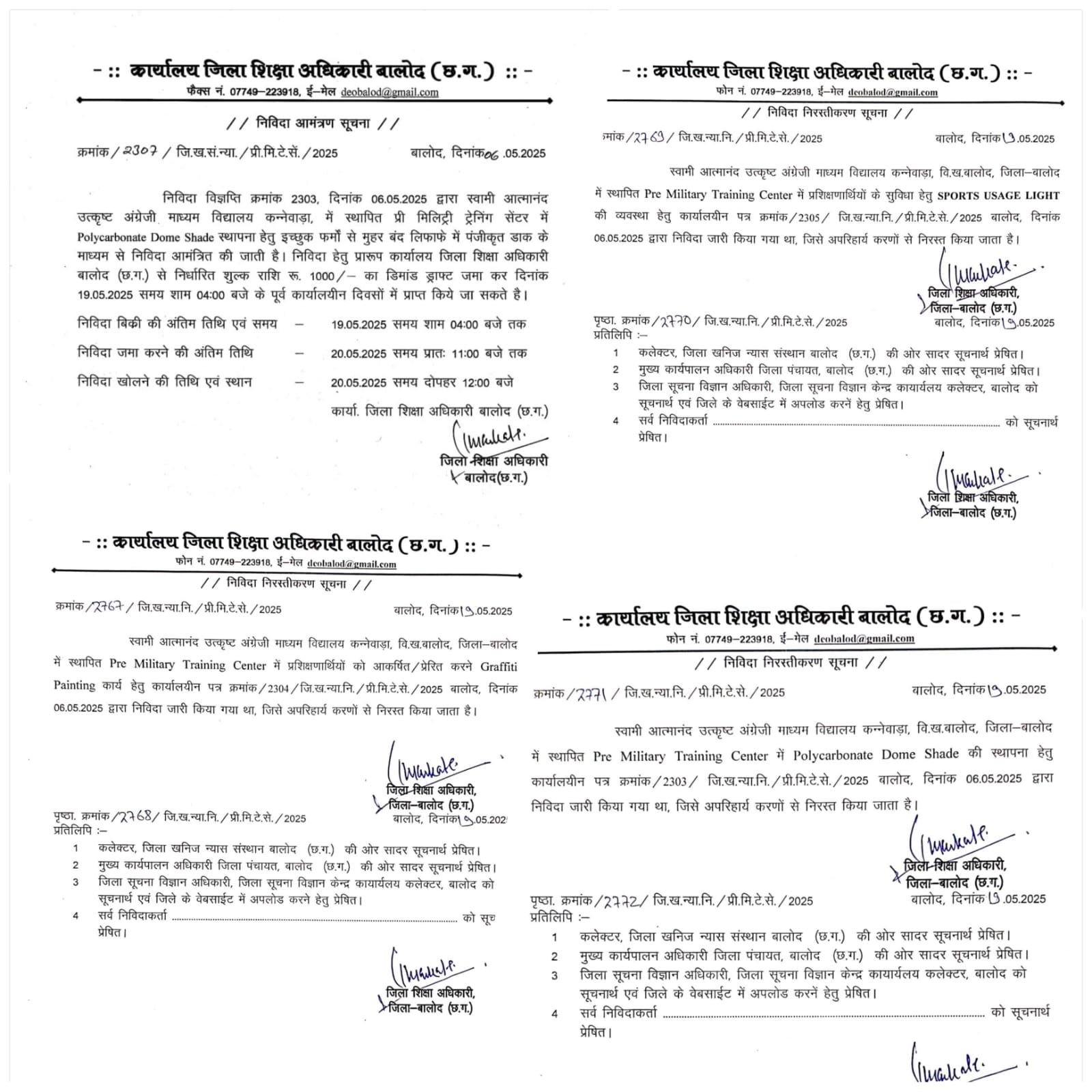 बालोद। विवादित टेंडर को लेकर बालोद के जिला शिक्षा अधिकारी आखिर बैकफुट पर आ गए हैं। डीएमएफ फंड से पॉलीकार्बोनेट डोम शेड निर्माण सहित अन्य कार्यो के नियम विरुद्ध टेंडर को आखिरकार, निरस्त करना पड़ा।