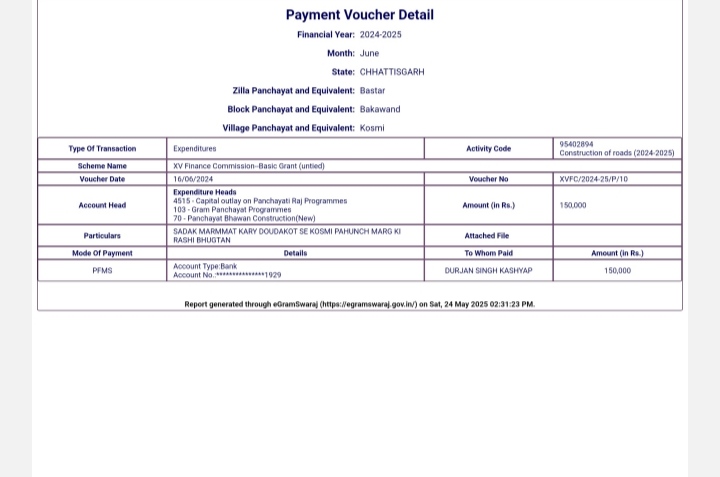 मुख्यमंत्री विष्णु देव भले ही विशुद्ध रूप से जनता के लिए सुशासन तिहार मना रहे हैं, मगर असली सुशासन तो पर्व ग्राम पंचायत के सचिव और अन्य अधिकारी सरकारी धन को मिलबांट कर मना रहे हैं। विकासखंड बकावंड में 15वें वित्त आयोग की राशि से सड़क मरमत और मुरमीकरण कराने हेतु 4 से 5 लाख रुपए का आहरण कर लिया गया है, जबकि असल में काम कराया ही नहीं गया है।कोसमी और भेजरी पदर पंचायत दोनों का सचिव एक ही व्यक्ति खगेश्वर कश्यप है, जो विगत 10 वर्षों से वहां पदस्थ है। सचिव पर ग्रामीणों ने आरोप लगाया कि उन्होंने मुरूम बिछाई और समतलीकरण के नाम पर कई किश्तों में करीब 5 लाख रुपए अपने कथित भाई दुर्जन कश्यप के खाते में डाल दिया और बाद में खुद निकाल लिया है। बताया गया है कि सचिव ने दौड़कोट से कोसमी तक पहुंच मार्ग मरम्मत के नाम पर 2 लाख रुपए का भुगतान दर्शाया है। इसकी वाउचर संख्या एक्सवीएफसी 2024-25 पी/11 और प्राप्तकर्ता दुर्जन सिंह कश्यप है। इसी सड़क की मरम्मत के नाम पर उसी दुर्जन सिंह कश्यप को डेढ़ लाख का एक और भुगतान दर्शाया गया है। इसकी वाउचर संख्या एक्सवीएफसी 2024-25, पी/10 है। इसी तरह आंगनबाड़ी चौक से आमाडोंगरी पहुंच मार्ग के मुरमीकरण के नाम पर दुर्जन सिंह कश्यप को ही 1 लाख 49 हजार रुपए का भुगतान करना दर्शाया गया है। इसकी वाउचर संख्या एक्सवीएफसी 2024-25, पी/08 है। बताया गया है कि दुर्जन सिंह कश्यप पंचायत सचिव खगेश्वर कश्यप का भाई है। खगेश्वर कश्यप अपने भाई के खाते में रुपए डालकर बाद में खुद निकाल लेता है। इस तरह 15वें वित्त मद की राशि की खुलीलूट चल रही है।