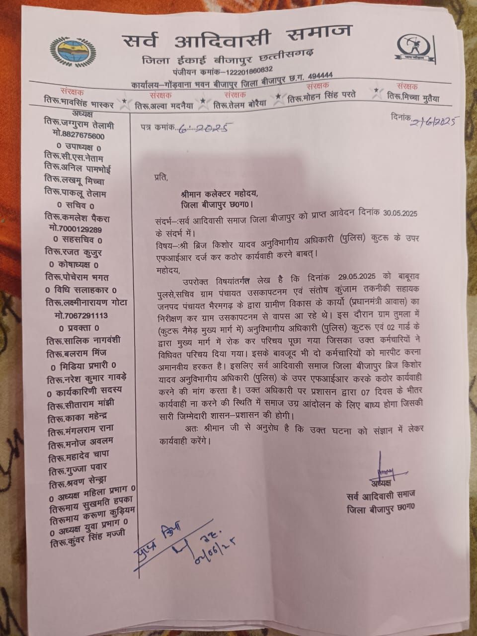 जग्गूराम तेलामी ने कहा कि आदिवासी मुख्यमंत्री वाले छत्तीसगढ़ में ही आदिवासी सुरक्षित नहीं हैं। दोनों आदिवासी अधिकारियों को एसडीओपी के इशारे पर इतनी पिटाई की गई कि उनके शरीर में मार के निशान पड़ गए। ऐसी घटना आदिवासी समाज कभी स्वीकार नहीं करता है। बीजापुर विकासशील जिला है तथा सभी अधिकारी कर्मचारियों का यहां के विकास में भागीदारी रही है और रहेगी।