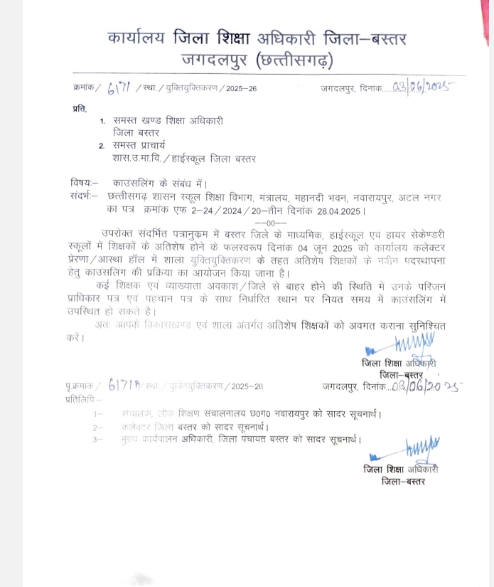 जिला शिक्षा अधिकारी के हस्ताक्षर के माध्यम से खंड शिक्षा अधिकारी एवं प्राचार्य को पत्र जारी किया है। बस्तर जिले के माध्यमिक, हाईस्कूल एवं हायर सेकंडरी स्कूलों में शिक्षकों के अतिशेष होने के फलस्वरूप 4 जून को कार्यालय कलेक्टर प्रेरणा व आस्था हॉल में शाला युक्तियुक्तिकरण के तहत अतिशेष शिक्षकों के नवीन पदस्थापना हेतु काउंसलिंग की प्रक्रिया का आयोजन किया जाना है। कई शिक्षक एवं व्याख्याता अवकाश तथा जिले से बाहर होने की स्थिति में उनके परिजन प्राधिकार पत्र एवं पहचान पत्र के साथ निर्धारित स्थान पर नियत समय में काउंसलिंग