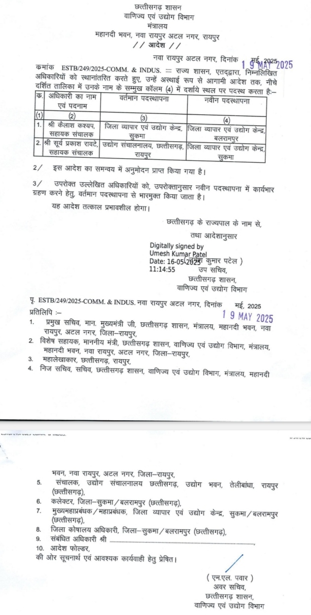 मंत्रालय महानदी भवन, नवा रायपुर अटल नगर, रायपुर द्वारा 19 मई को जारी आदेश में सहायक संचालक कैलाश कश्यप जिला व्यापार एवं उद्योग केंद्र सुकमा का तबादला बलरामपुर कर दिया गया है। संचलनालय ने नई पदस्थापना वाली जगह पर कार्यभार ग्रहण करने के लिए कैलाश कश्यप को भरमुक्त भी कर दिया गया है। आदेश में कहा गया है कि यह आदेश तत्काल प्रभावशील होगा। ज्ञात हो कि 8 वर्षों से अधिक समय से पदस्थ सहायक संचालक का तबादला आदेश वाणिज्य एवं उद्योग विभाग के सचिव उमेश पटेल द्वारा 19 मई को जारी किया जा चुका है। उक्त आदेश में स्पष्ट उल्लेख है कि सुकमा जिले से भारमुक्त करते हुए बलरामपुर में ज्वाईनिंग लेने का आदेश जारी कि गया है। आदेश जारी होने के 20 दिनों बाद भी विभागीय सचिव के आदेशों का पालन नहीं हो सका है। इससे अंदाजा लगाया सकता है पूर्व मंत्री के करीबी माने जाने वाले अधिकारी की पैठ कितनी मजबूत है, जिन पर जिले के जिम्मेदार अधिकारी भी मेहरबान हैं और सत्ता