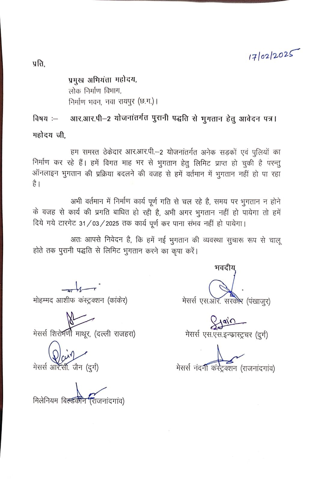उल्लेखनीय है कि केंद्र सरकार की योजना रूरल रोड प्रोजेक्ट की ठेकेदारों के 150 करोड़ से अधिक की देनदारियां अटकी हुई थी। ईएनसी वीके भतपहरी ने केंद्रीय मद की राशि का भुगतान कई कारणों से आपत्ति लगाकर रोक दिया है। मार्च के बाद के कराए गए कार्यों का भुगतान न होने से ठेकेदारों में रोष है। कार्य ठप होने के कारण ईएनसी ने ठेकेदारों की बैठक ली। बैठक में उनका काम ठीक नहीं होने की बात कहकर धमकाया जा रहा है। ठेकेदारों द्वारा काम के संबंध में कहीं की कोई जानकारी पूछे जाने पर स्पष्ट जवाब नहीं दिया जा रहा है। ठेकेदारों ने भुगतान नहीं किए जाने का सवाल उठाया तो उसे टाल गए।