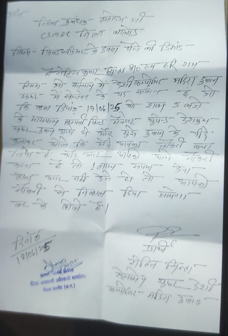 बालोद जिले का अबकारी विभाग हमेशा सुर्खियों में बना रहता है। बहुत पहले से ही शराब दुकानों के सेल्समैन से हर माह अवैध वसूली करने का आरोप लग रहा है, लेकिन अधिकारियों द्वारा अभी तक कोई कार्रवाई नही की गई है। आबकारी विभाग मुख्यमंत्री विष्णुदेव साय के पास है। कंपनी के कुछ कर्मचारी मुख्यमंत्री की छवि खराब करने में कोई कसर नही छोड़ रहे हैं। ऊपर से विभाग के अधिकारी भी मौन साधे बैठे हैं। पिछले कुछ दिनों से कंपनी के प्रदीप सिंह और बालोद जिले के फील्ड आफिसर द्वारा कर्मचारियों से अवैध वसूली करने की शिकायतें लगातार सामने आ रही हैं। लेकिन कोई कार्रवाई क्यो नही की जा रही है यह संदेश का विषय है। बालोद जिले के गुरुर देशी कम्पोजिट शराब दुकान के सेल्समैन रोहित सिन्हा ने लिखत में बालोद जिला आबकारी अधिकारी के पास शिकायत की है। शिकायत में रोहित ने कहा है कि शराब दुकान में भूपेंद्र देशमुख आया और कहने लगा कि तुम्हें अपनी नौकरी बचानी है और आगे नौकरी करनी है तो मुझे एक लाख रुपए दे नही तो तुम्हें नौकरी से निकल दिया जाएगा। ऐसी करतूत बालोद जिले में चल रही है और विष्णुदेव सरकार का नाम खराब हो रहा है। अब देखना यह है कि रोहित सिन्हा की शिकायत पर क्या कार्रवाई होती है?