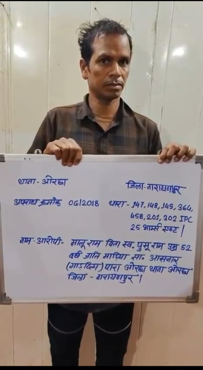 नारायणपुर जिले की ओरछा थाना पुलिस ने द्वारा वर्ष 2018 के पंजीबद्ध अपराध क्रमांक 06/2018, धारा 147, 148, 149, 364, 458, 201, 302 भारतीय दण्ड संहिता एवं 25 आर्म्स एक्ट के तहत वांछित स्थायी वारंटी आरोपी नक्सली मालूराम पिता स्व. पुर्सु राम उम्र 52 वर्ष निवासी ग्राम आसनार (गाड़रिका) थाना ओरछा, जिला नारायणपुर को गिरफ्तार किया गया है।आरोपी मालूराम पूर्व में नक्सली संगठन जनताना सरकार में सक्रिय रूप से कार्यरत रहा है एवं वर्ष 2016-17 में अध्यक्ष के रूप में कार्य करते हुए कई नक्सली वारदातों में शामिल रहा है। आरोपी द्वारा अन्य नक्सली सदस्यों के साथ मिलकर ग्राम आसनार, बड़े सियानार एवं कोचाकोडसी क्षेत्र में ग्रामीणों को डरा-धमकाकर मीटिंग आयोजित की जाती थी तथा 14 मार्च 2018 को नक्सलियों द्वारा ग्राम बड़े सियानार में हमला कर ग्रामवासियों की निर्मम हत्या की गई थी। इस घटना में आरोपी मालूराम भी अन्य नक्सलियों के साथ सक्रिय रूप से शामिल था। उक्त मामले में पुलिस द्वारा लंबे समय से आरोपी की पतासाजी की जा रही थी, जिसे गिरफ्तार कर न्यायिक रिमांड पर कोर्ट में पेश किया गया।