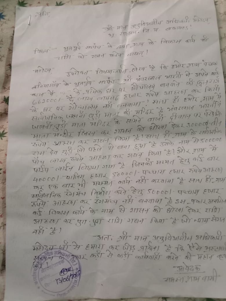शिकायत में ग्रामीणों ने बताया है कि बनियागांव के पूर्व सरपंच भंवरलाल भारती ने अपने कार्यकाल में के प्रत्येक घर में शौचालय बनवाने के नाम पर 6 लाख 62 हजार रुपए आहरित कर लिए, मगर किसी भी घर में शौचालय नहीं बनवाया। सरपंच ने गांव में परदेशनीन माता मंदिर निर्माण के नाम से तीन लाख रुपए निकाल लिए, मंदिर नहीं बनाया। ग्राम में पहले से मौजूद जलनी गुड़ी माता मंदिर के सामने की दीवार पर परदेशनीन माता मंदिर लिखवा कर शासन को यह बताने की कोशिश कि यही नवनिर्मित परदेशनीन माता मंदिर है। इस तरह पूर्व सरपंच भंवर लाल भारती ने शासन की आंखों में धूल झोंकने का काम किया है।ग्रामीणों ने आगे बताया है कि गांव में पूर्व से स्थित रामदेव गुड़ी को नया बना बताकर पूर्व सरपंच भंवर लाल भारती 5 लाख रुपए हजम कर गए।. गांव में बिछी पेयजल पाईप लाइन मरम्मत के नाम पर 40 हजार रुपए और 50 हजार रुपए कई बार निकाले गए, जबकि मरम्मत कार्य कभी नहीं कराया गया। सार्वजनिक, रंगमंच निर्माण के लिए भंवरलाल भारती ने 50 हजार रुपए निकाल लिए मगर रंगमंच नहीं बनवाया है। इसी प्रकार कई अन्य कार्यों के नाम पर भंवर लाल भारती ने ग्राम पंचायत के लाखों रुपयों का गबन किया है। ग्रामीणों ने पूर्व सरपंच भंवर लाल भारती के सारे कारनामों की जांच कराने और उनके खिलाफकड़ी कार्रवाई करने की मांग एसडीएम से की है।