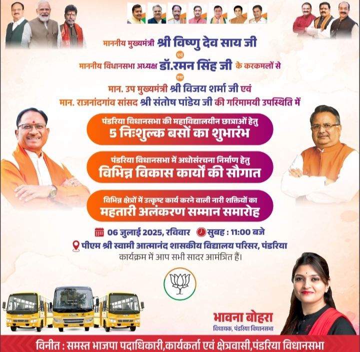 मुख्यमंत्री श्री विष्णुदेव साय पंडरिया में आयोजित “बेटी बचाओ, बेटी पढ़ाओ“ अभियान में सहभागिता और नारी शक्तियों के सम्मान समारोह में पंडरिया विधानसभा के 26 उत्कृष्ट कार्य करने वाली नारी शक्तियों को महतारी अलंकरण सम्मान से सम्मानित करेंगे। इसके तहत राष्ट्रपति के आमत्रंण पर 75वें गणतंत्र दिवस समारोह में बैगा परिवारों की ऐतिहासिक उपस्थिति देने वाली श्रीमती जगतीन बाई बैगा, श्रीमती तितरी बाई और श्रीमती बली बाई को महतारी अलंकरण सम्मान से सम्मानित करेंगे। छत्तीसगढ़ माध्यमिक शिक्षा मंडल बोर्ड परीक्षा के हायर सेकेण्डरी में टॉप 5 में जगह बनाने वाली सुमन महोबिया, लक्ष्मी, युकांक्षी डड़सेना, रीना साहू, कुमारी प्रियंका और हाई स्कूल की प्रीसी चंद्राकर, मौली चंद्राकर, यशोमति साहू, आस्था धीरी, भौमी निषाद को महतारी अलंकरण सम्मान से सम्मानित करेंगे। इसके साथ ही खेल पदक प्राप्त खिलाड़ी नीतू, मान्या, पूजा, हर्षिता, निःशुल्क ट्रेनिग प्रदान करने वाली रीना शार्मा को सम्मानित करेंगे। महिला स्वसहायता समूह के अंतर्गत जय मां भवानी महिला स्व सहायता समूह बसनी, जय मां संतोषी महिला स्व सहायता समूह जमुनिया, महालक्ष्मी महिला स्व सहायता समूह मैनपुरा, सोनाक्षी महिला स्व सहायता समूह रेहूंटाखुर्द, नूहा निषाद महिला स्व सहायता समूह दशरंगपुर, महतारी वंदन योजना की राशि से सुकन्या खाता खुलवाने वाली कीर्ति, राजकुमारी, अंजनी पटेल को महतारी अलंकरण सम्मान से सम्मानित करेंगे।