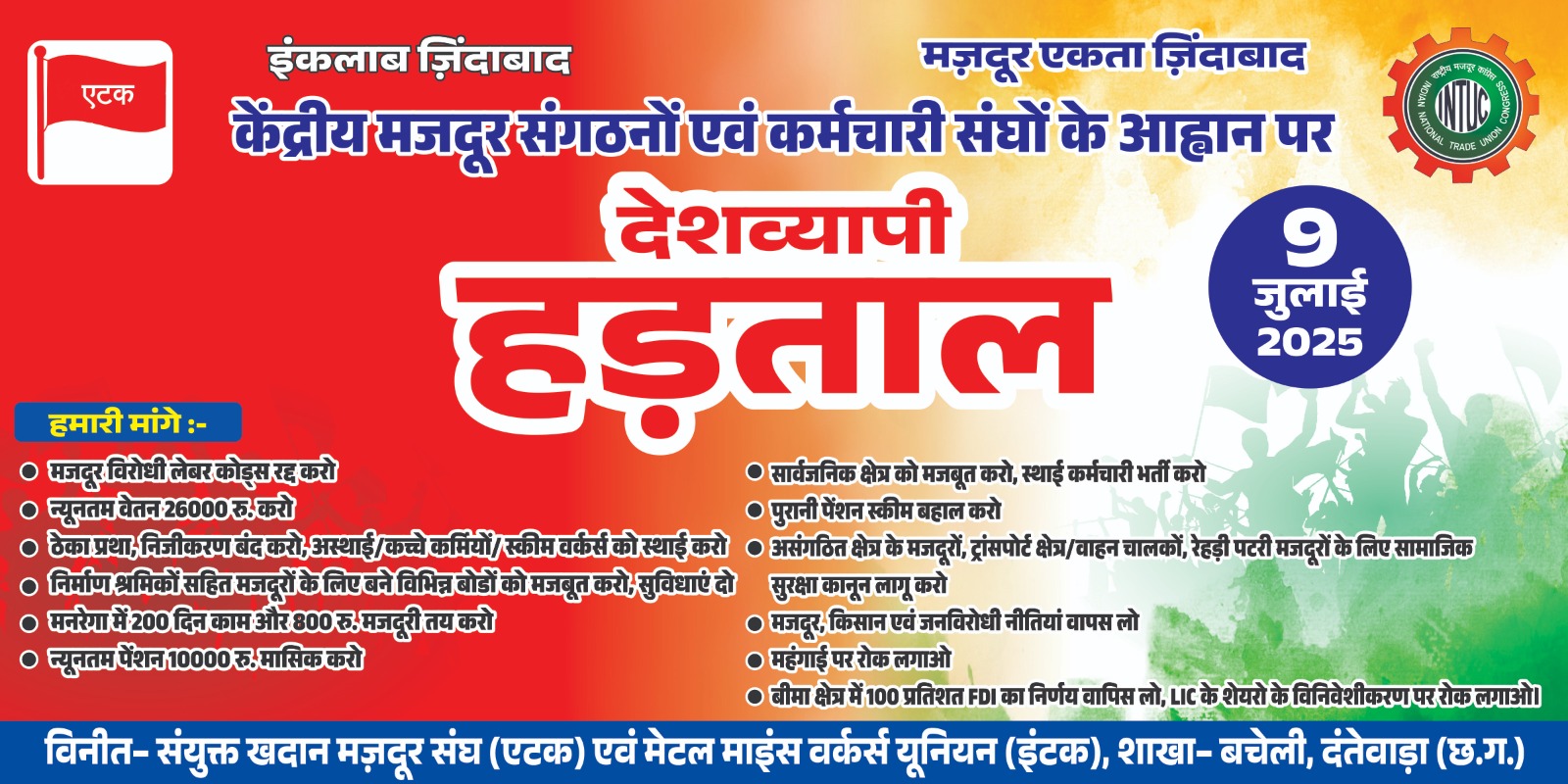 जगदलपुर। केंद्र सरकार की कथित मज़दूर-किसान विरोधी नीतियों के खिलाफ 9 जुलाई को राष्ट्रव्यापी औद्योगिक हड़ताल का आह्वान किया गया है। संयुक्त खदान मजदूर संघ (एटक) एवं मेटल माइंस वर्कर्स यूनियन (इंटक) का लाल मैदान, बचेली में धरना-प्रदर्शन होगा। इन संगठनों ने कहा है कि श्रमिकों, किसानों, बेरोज़गारों, युवाओं एवं आम जनता पर लगातार हमले कर रही केंद्र सरकार की मज़दूर विरोधी, जन विरोधी एवं कॉर्पोरेट परस्त नीतियों के खिलाफ केंद्रीय ट्रेड यूनियनों एवं स्वतंत्र कर्मचारी फेडरेशनों के संयुक्त मंच के आह्वान पर 9 जुलाई को राष्ट्रव्यापी औद्योगिक हड़ताल की जा रही है। इस राष्ट्रीय आह्वान के समर्थन में संयुक्त खदान मजदूर संघ (एटक) एवं मेटल माइंस वर्कर्स यूनियन (इंटक) द्वारा लाल मैदान, बचेली में एक दिवसीय धरना–प्रदर्शन किया जाएगा, जिसमें बड़ी संख्या में खदान श्रमिक, ठेका मज़दूर, सेवानिवृत्त कर्मचारी तथा स्थानीय नागरिक भाग लेंगे।
