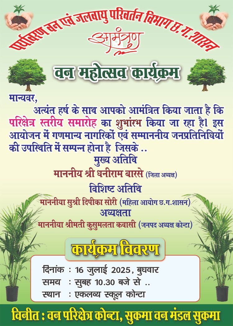 जगदलपुर। बस्तर संभाग के सुकमा जिले के कोंटा में वन विभाग द्वारा आयोजित वन महोत्सव कार्यक्रम में वन परिक्षेत्र अधिकारी कोंटा महेश पासवान ने निर्वाचित कांग्रेसी जनप्रतिनिधियों की घोर उपेक्षा की।
