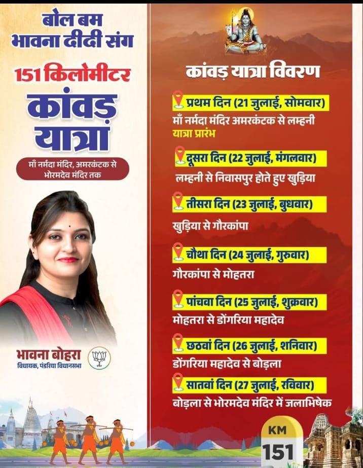 छत्तीसगढ़ की जनता और प्रदेश की सुख-समृद्धि व खुशहाली के लिए पंडरिया विधायक भावना बोहरा द्वारा 21 जुलाई को सावन माह के दूसरे सोमवार को सुबह 7 बजे माँ नर्मदा मंदिर अमरकंटक से भोरमदेव मंदिर तक लगभग 151 किलोमीटर की कांवड़ यात्रा शुरू की जाएगी। भावना बोहरा माँ नर्मदा मंदिर से कांवड़ में जल लेकर पद यात्रा करते हुए डोंगरिया महादेव का जलाभिषेक करने के पश्चात् भोरमदेव मंदिर में शिवजी का जलाभिषेक कर अपनी यात्रा समाप्त करेंगी। यह छत्तीसगढ़ के इतिहास में पहली बार होगा की एक महिला जनप्रतिनिधि इतनी कठिन यात्रा करके प्रदेश व प्रदेशवासियों की सुख-समृद्धि के लिए 151 किलोमीटर की कांवड़ यात्रा करेंगी। इस दौरान भावना बोहरा माँ नर्मदा मंदिर अमरकंटक से लहनी, खुड़िया, पंडरिया, मोहतरा से डोंगरिया महादेव पहुंचेगी जहाँ शिवजी का जलाभिषेक करेंगी तत्पश्चात डोंगरिया महादेव से बोड़ला होते हुए भोरमदेव मंदिर में पूजा-अर्चना व शिवजी का जलाभिषेक कर अपनी यात्रा का समापन करेंगी।