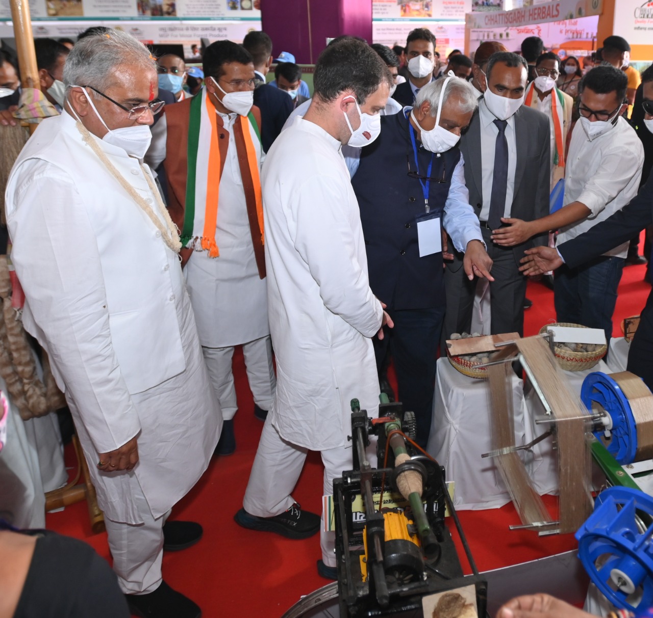 रायपुर :- लोकसभा सांसद राहुल गांधी ने आज राजधानी रायपुर के साईंस कॉलेज मैदान में छत्तीसगढ़ शासन की महत्वाकांक्षी ‘राजीव गांधी ग्रामीण भूमिहीन कृषि मजदूर न्याय योजना’ और ‘राजीव युवा मितान क्लब योजना’ का शुभारंभ किया साथ ही महात्मा गांधी की स्मृतियों को संजोने के लिए नवा रायपुर में स्थापित किए जाने वाले ‘सेवाग्राम’ तथा ‘छत्तीसगढ़ अमर जवान ज्योति’ की आधारशिला रखी। इस अवसर पर मुख्यमंत्री भूपेश बघेल, मंत्रिमंडल के सभी सदस्यों सहित बड़ी संख्या में जनप्रतिनिधिगण और गणमान्य नागरिक उपस्थित रहे।