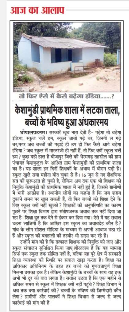 भोपालपटनम। बीजापुर जिले के भैरमगढ़ ब्लॉक अंतर्गत ग्राम पंचायत केशकुतुल के आश्रित ग्राम केशामुड़ी की प्राथमिक शाला में आखिरकार फिर से बच्चों की पढ़ाई शुरू हो गई है। बीते माह 16 जून से बंद पड़ी यह शाला अब खुल चुकी है और शिक्षक की नियुक्ति भी कर दी गई है। स्कूल में अब क, ख, ग, घ और दो एकम दो, दो दूनी चार की गूंज फिर से सुनाई देने लगी है।