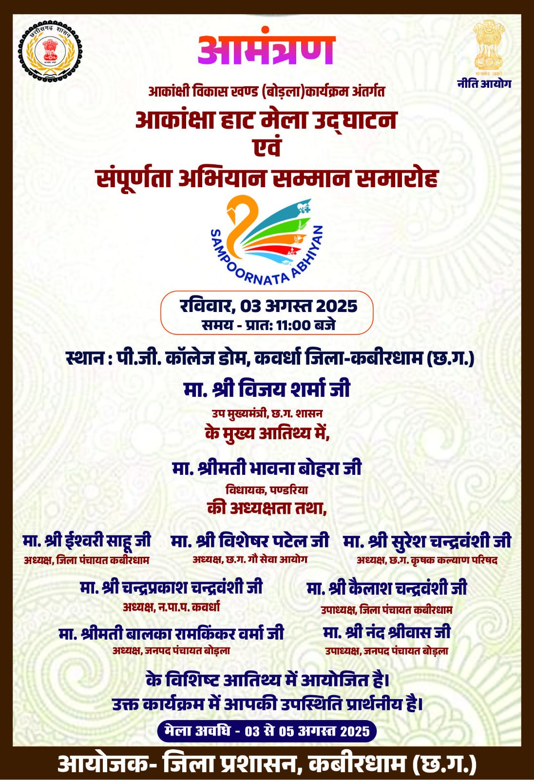 कवर्धा स्थित कृषि विज्ञान केन्द्र में आयोजित जिला स्तरीय समारोह में कार्यक्रम से छत्तीसगढ़ राज्य कृषक कल्याण परिषद के अध्यक्ष श्री सुरेश चन्द्रवंशी, जिला पंचायत उपाध्यक्ष श्री कैलाश चंद्रवंशी सहित जिले के विभिन्न विकासखंडों से आए 385 से अधिक किसान वर्चुअल माध्यम से जुड़े। इस दौरान प्रधानमंत्री श्री मोदी ने छत्तीसगढ़ के 25.47 लाख से अधिक किसानों को 553 करोड़ रुपये से अधिक की राशि ट्रांसफर की। कार्यक्रम में विशिष्ट अतिथि के रूप में जनपद पंचायत कवर्धा की अध्यक्ष श्रीमती सुषमा गनपत बघेल, उपाध्यक्ष श्री गणेश तिवारी एवं ग्राम पंचायत नेवारी के सरपंच श्री सेवाराम पात्रे उपस्थित रहे।