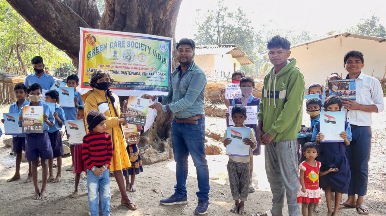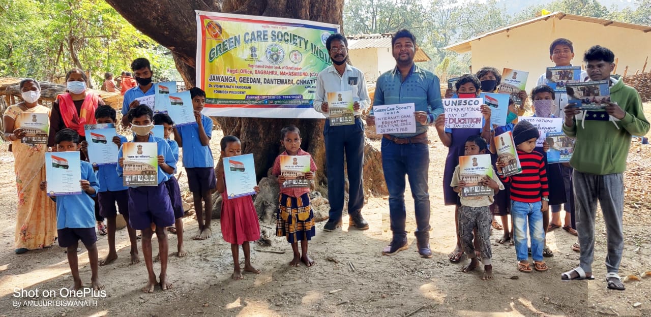 दन्तेवाड़ा :- ग्रीन केयर सोसायटी इंडिया छत्तीसगढ़ द्वारा संयुक्त राष्ट्र शैक्षिक, वैज्ञानिक और सांस्कृतिक संगठन यूनेस्को के सहयोग से “चेंजिंग कोर्स, ट्रांसफॉर्मिंग एजुकेशन” विषय पर 24 जनवरी 2022 अंतर्राष्ट्रीय शिक्षा दिवस के अवसर पर उत्सव अंतर्राष्ट्रीय शिक्षा उत्सव 24 जनवरी से 7 फरवरी तक ऑनलाइन व ऑफलाइन माध्यम से मनाया गया। दंतेवाड़ा जिले के गीदम विकास खंड अंर्तगत ग्राम जावांगा में शिक्षा जागरुकता कार्यक्रम आयोजित किया गया। कोरोना महामारी के प्रभाव से दंतेवाड़ा जिले में विद्यालय, शैक्षणिक संस्थानों सभी बंद हुआ था।समाज में शिक्षा की बहुत ही जरूरत समझ कर ग्रीन केयर सोसायटी इंडिया के डायरेक्टर तथा अंतर्राष्ट्रीय शिक्षक संपर्क अधिकारी अमुजुरी बिश्वनाथ ने ग्राम जावांगा के बच्चों के पास पहुंचे और “पढ़े लिखे दंतेवाड़ा, पढ़े लिखे छत्तीसगढ़, पढ़े लिखे भारत”, शिक्षा सबका मौलिक अधिकार का पोस्टर प्रदर्शन करते हुए शिक्षा जागरुकता कार्यक्रम किया। पठन, गणितीय कौशल, भारत का संविधान पुस्तक, बिस्कुट वितरण किया।