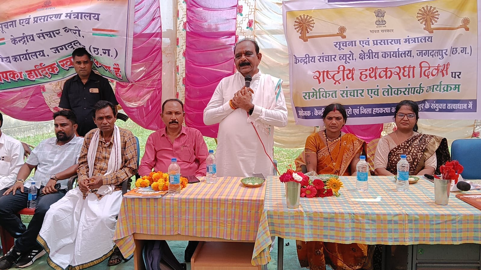 जगदलपुर :- (राष्ट्रीय हथकरघा दिवस ग्राम बाजवान्ड में कार्यक्रम का आयोजन) केंद्रीय संचार ब्यूरो, क्षेत्रीय कार्यालय जगदलपुर एवं जिला हथकरघा विभाग जगदलपुर द्वारा राष्ट्रीय हथकरघा दिवस पर बस्तर जिले के बकावंड ब्लॉक के ग्राम बजावंन में एक विशेष प्रचार कार्यक्रम का आयोजन किया गया। कार्यक्रम के मुख्य अतिथि विधायक श्री लखेश्वर बघेल, जिला पंचायत सदस्य श्री बनवासी मोरे, पूर्व जनपद सदस्य नारायण बघेल , पूर्व सरपंच भगवान भारती, ग्राम सरपंच भगवती भारती, जिला हथकरघा कार्यालय जगदलपुर के उपसंचालक अनिल कुमार सोम, निरीक्षक श्री रोहित पात्रे, एवं रमेश कुमार के उपस्थिति में कार्यक्रम का शुभारंभ किया गया। कार्यक्रम में उपसंचालक श्री अनिल कुमार सोम एवं निरीक्षक श्री रोहित पातरे ने विभाग द्वारा चलाया जाए रहे योजनाओं के बारे में जानकारी दी एवं आज राष्ट्रीय हथकरघा दिवस के महत्व के बारे में जानकारी दी। खंड स्वास्थ्य अधिकारी बकावंड के सहयोग से बुनकरों के लिए आंख जांच शिविर एवं चश्मा का वितरण किया गया जिसमें करीब 50 बुनकर लाभान्वित हुए। तद उपरांत केंद्रीय संचार ब्यूरो क्षेत्रीय कार्यालय जगदलपुर के प्रभारी श्री बी एस ध्रुव द्वारा एक प्रश्न मंच का आयोजन किया गया जिसमें राष्ट्रीय हथकरघा दिवस के बारे में कुछ छोटे-छोटे प्रश्न किए गए सही उत्तर देने वाले प्रतिभागी को विभाग की ओर से तुरंत पुरस्कृत किया गया। कार्यक्रम में अतिथि के द्वारा मां के नाम एक पेड़ भी लगाया गया। कार्यक्रम में बुनकर समिति के 10 हितग्राहियों को लूम प्रदान किया गया। साथी बुनकर समिति के तीन मेधावी छात्र-छात्राओं को विभाग द्वारा पुरस्कृत किया गया जिसमें मुख्य रूप से गौरव चंदेल, सुमित मंडल एवं निमिषा झाली को प्रदान किया गया। हैंडलूम वितरण घनश्याम झाली, रामचंद्र झाली, कुसनो झाली, फूलचंद नेताम, चौवन मरकाम, बैद्यनाथ झाली, गुप्तो मरकाम, शंभू नाथ नेताम, नकुल नाग, लक्षीम झाली को प्रदान किया गया। कार्यक्रम का सफल संचालन रमेश कुमार द्वारा किया गया। कार्यक्रम में वतन केसरी के छत्तीसगढ़ हेड मीनाक्षी जोशी भी उपस्थित रही साथ ही आंगनवाड़ी कार्यकर्ता एवं बड़ी संख्या में बुनकरों के अलावा ग्रामीण जन उपस्थित थे। कार्यक्रम में कंकालिन प्राथमिक बुनकर सहकारी समिति मर्यादित बजावान्ड का विशेष सहयोग रहा