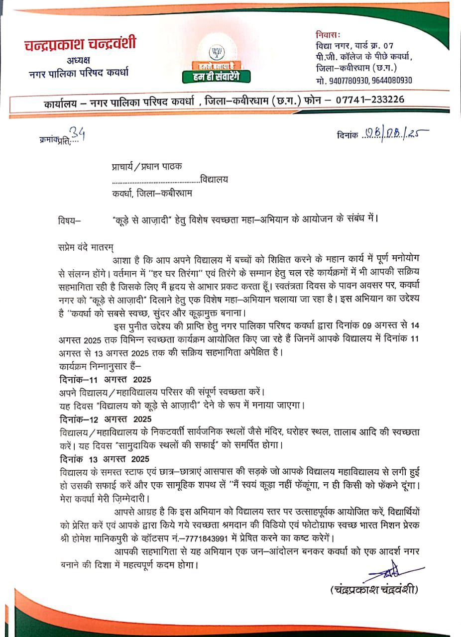 नगर पालिका अध्यक्ष चंद्रप्रकाश चंद्रवंशी ने बताया पत्र बताया कि 15 अगस्त 2025 को हम अपना 78वां स्वतंत्रता दिवस बड़े ही हर्षाेल्लास एवं गर्व के साथ मनाने जा रहे हैं। यह दिन हमें न केवल आज़ादी के महान बलिदानों की याद दिलाता है, बल्कि वर्तमान में हमारे कर्तव्यों एवं संकल्पों का भी बोध कराता है। उन्होनें बताया कि नगर पालिका परिषद कवर्धा द्वारा ‘‘कूड़े से आज़ादी‘‘ को लेकर लगातार 16 फरवरी 2025 से ‘‘स्वच्छ, सुंदर तथा विकसित कवर्धा बनाने हेतु संकल्प‘‘ को लेकर विशेष स्वच्छता अभियान चलाया जा रहा है साथ ही शहर के तालाबों में प्रत्येक रविवार को ‘‘02 घंटे का श्रमदान‘‘ एवं श्रावण मास के प्रत्येक रविवार को ‘‘तीर्थ स्थल-भोरमदेव मंदिर में‘‘ स्वच्छता श्रमदान कर लोगो को जागरूक किया गया। इस श्रमदान का मुख्य उद्देश्य है कवर्धा शहर को एक स्वच्छ, सुंदर और विकसित नगर के रूप में स्थापित करना। उन्होनें कहा कि विकसित भारत की कल्पना तभी साकार होगी जब हमारे शहर के साथ-साथ प्रत्येक वार्ड, शासकीय कार्यालय, मंदिर, बाजार व अन्य सार्वजनिक स्थल स्वच्छ और सुनियोजित हों।