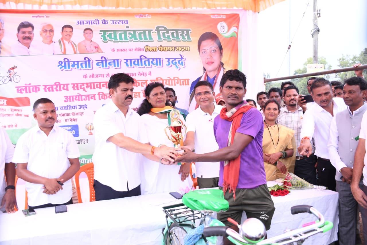 बीजापुर :- स्वतंत्रता दिवस के अवसर पर जिला पंचायत सदस्य और कांग्रेस नेत्री नीना रावतिया उद्दे ने नेमेड में विकासखंड स्तरीय सद्भावना साइकिल रेस प्रतियोगिता का आयोजन किया । खेल को बढ़ावा देने के साथ पर्यावरण संरक्षण और सुरक्षा को लेकर आयोजित साइकिल रेस प्रतियोगिता में नेमेड सहित आसपास के सैकड़ों नागरिकों और युवाओं ने इसमें बढ़ चढ़ कर हिस्सा लिया ।