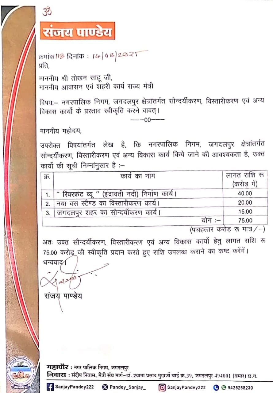 महापौर संजय पाण्डे ने अपने पत्र में लिखा है कि जगदलपुर संभाग मुख्यालय होने के साथ-साथ पर्यटन, व्यापार और सांस्कृतिक दृष्टि से भी अत्यंत महत्वपूर्ण शहर है। ऐसे में नगर निगम क्षेत्र के सौंदर्यीकरण और विस्तार कार्य समय की मांग है।