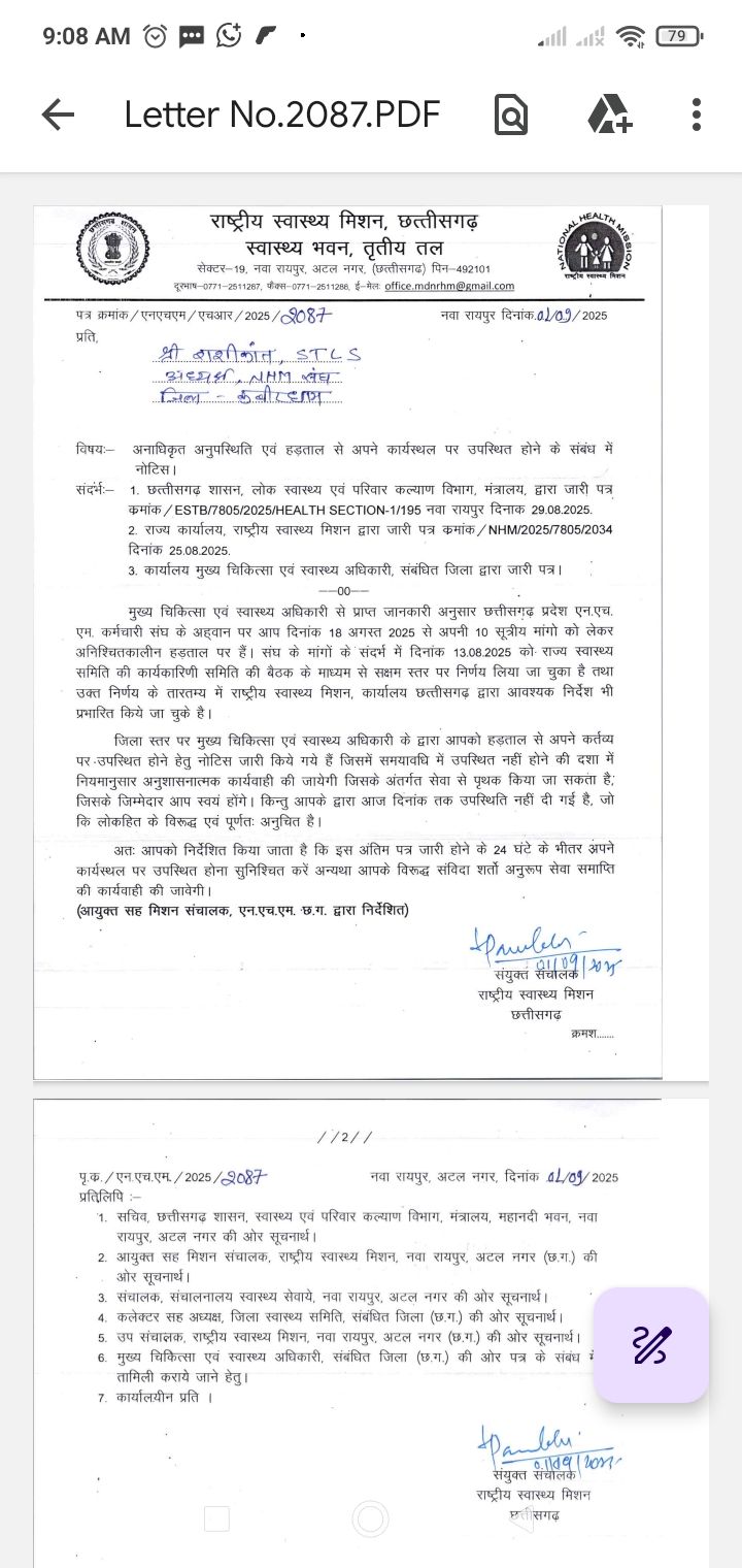 कवर्धा,,,प्रदेश भर के एनएचएम कर्मचारी पिछले माह 18 अगस्त से अनिश्चितकालीन हड़ताल पर है जिला मुख्यालयों में एनएचएम कर्मी अपनी मांगों को लेकर लगातार धरना प्रदर्शन कर रहे है इस दौरान राष्ट्रीय स्वास्थ्य मिशन ने हड़ताली कर्मचारियों को दंडात्मक कार्रवाई की चेतावनी दी है और नोटिस भी जारी किया है 381 कर्मचारियों ने राज्य सरकार द्वारा भेजी गई दंडात्मक नोटिस के आगे नही झुके और जिलाध्यक्ष शशिकांत शर्मा को मिले नोटिस की प्रतियां को कवर्धा धरना स्थल पर जलाया गया और संरक्षक जेम्स जॉन और समस्त पदाधिकारीगण और सदस्यों ने अध्यक्ष और संघ के साथ अंतिम लड़ाई तक सभी साथ देने की बात कही।