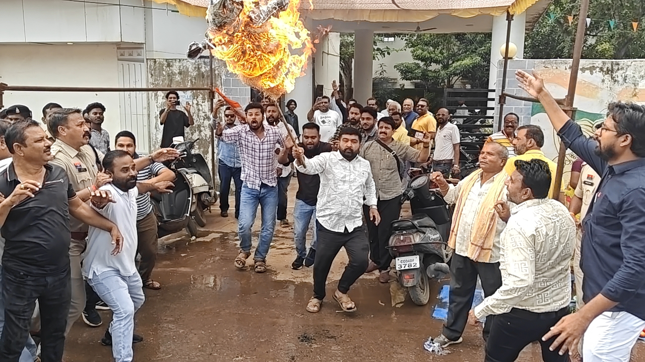 जगदलपुर :- आज छत्तीसगढ़ प्रदेश कांग्रेस कमेटी के निर्देशानुसार बस्तर जिला कांग्रेस कमेटी शहर ग्रामीण के संयुक्त नेतृत्व में शहर कांग्रेस अध्यक्ष सुशील मौर्य ग्रामीण जिलाध्यक्ष प्रेमशंकर शुक्ला के नेतृत्व में बीती रात जगदलपुर सर्किट हाउस में कमरा नहीं खोलने पर लकवाग्रस्त चतुर्थ वर्ग के कर्मचारी खितेंद्र पांडे को छत्तीसगढ़ शासन में भाजपा वन एवं परिवहन मंत्री केदार कश्यप के द्वारा अभद्र भाषा और पिटाई के खिलाफ मंत्री केदार कश्यप कि बर्खास्तगी को लेकर राजीव भवन के समक्ष पुतला दहन कर विरोध प्रदर्शन किया गया ….