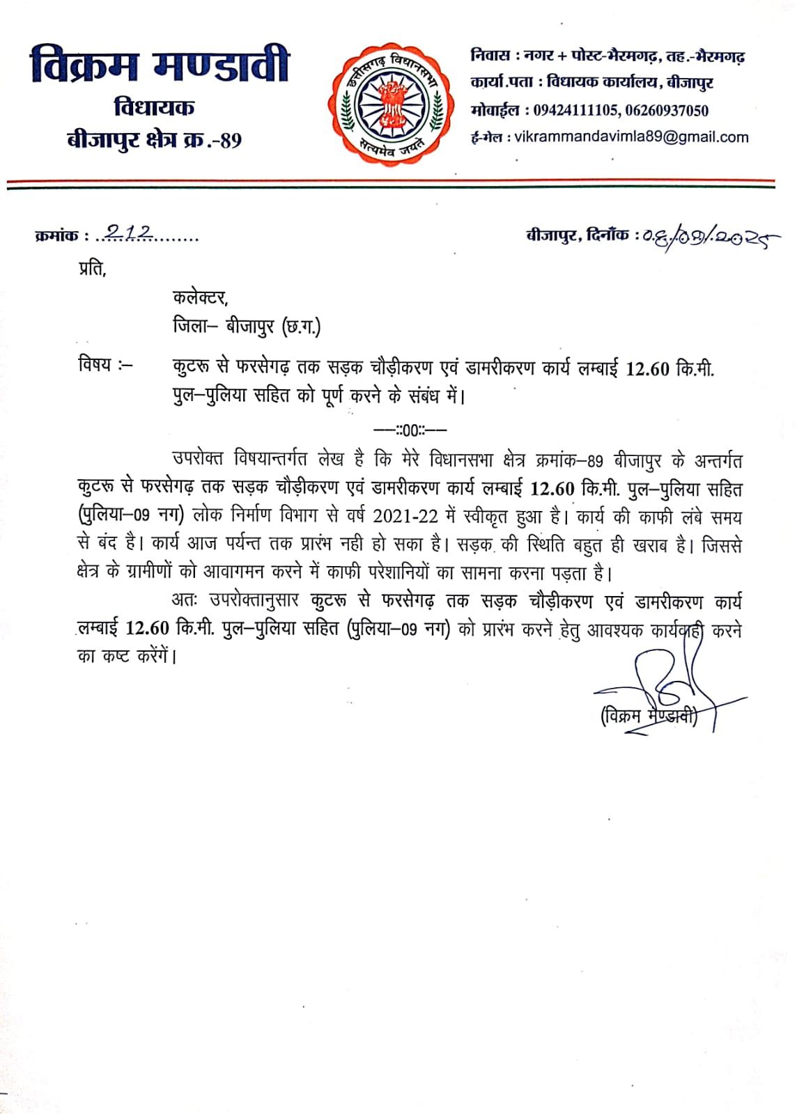 वर्ष 2021-22 में स्वीकृत कुटरू फ़रसेगढ़ मार्ग पर लगभग 12.60 किलोमीटर सड़क की चौड़ीकरण, डामरीकरण सहित पुल पुलियों का निर्माण होना शेष है। सड़क अधूरी होने के कारण क्षेत्रवासियों को आने जाने में काफ़ी परेशानियों का सामना करना पड़ रहा है। क्षेत्रवासियों की परेशानियों को गंभीरता से लेते हुए क्षेत्रीय विधायक विक्रम मण्डावी ने जिला कलेक्टर संबित मिश्रा से सड़क निर्माण के कार्य को तत्काल प्रारम्भ करने के संबंध में विस्तृत चर्चा करते हुए एक मांग पत्र भी सौंपा।