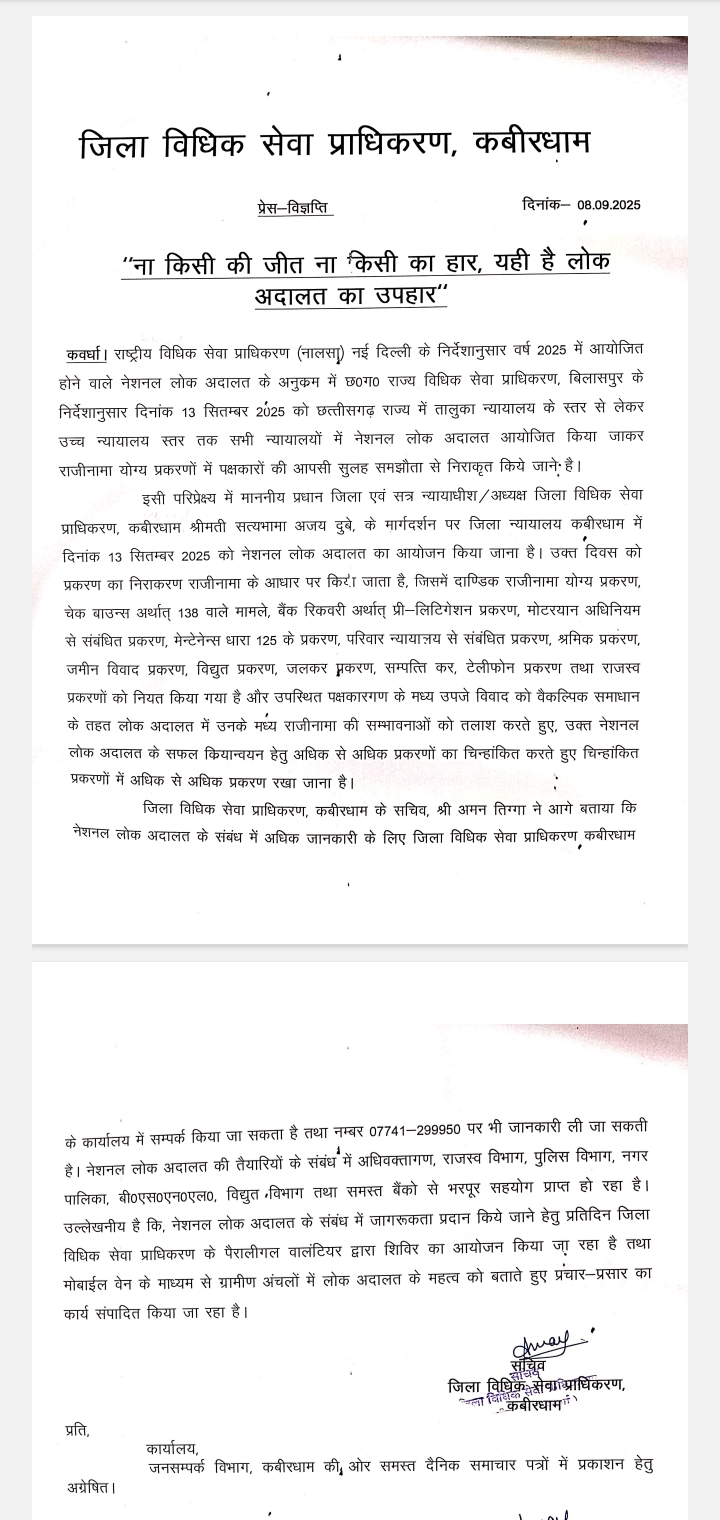 कवर्धा,,,राष्ट्रीय विधिक सेवा प्राधिकरण (नालसा) नई दिल्ली के निर्देशानुसार वर्ष 2025 में आयोजित होने वाले नेशनल लोक अदालत के अनुक्रम में छ0ग0 राज्य विधिक सेवा प्राधिकरण, बिलासपुर के निर्देशानुसार दिनांक 13 सितम्बर 2025 को छत्तीसगढ़ राज्य में तालुका न्यायालय के स्तर से लेकर उच्च न्यायालय स्तर तक सभी न्यायालयों में नेशनल लोक अदालत आयोजित किया जाकर राजीनामा योग्य प्रकरणों में पक्षकारों की आपसी सुलह समझौता से निराकृत किये जाने है।