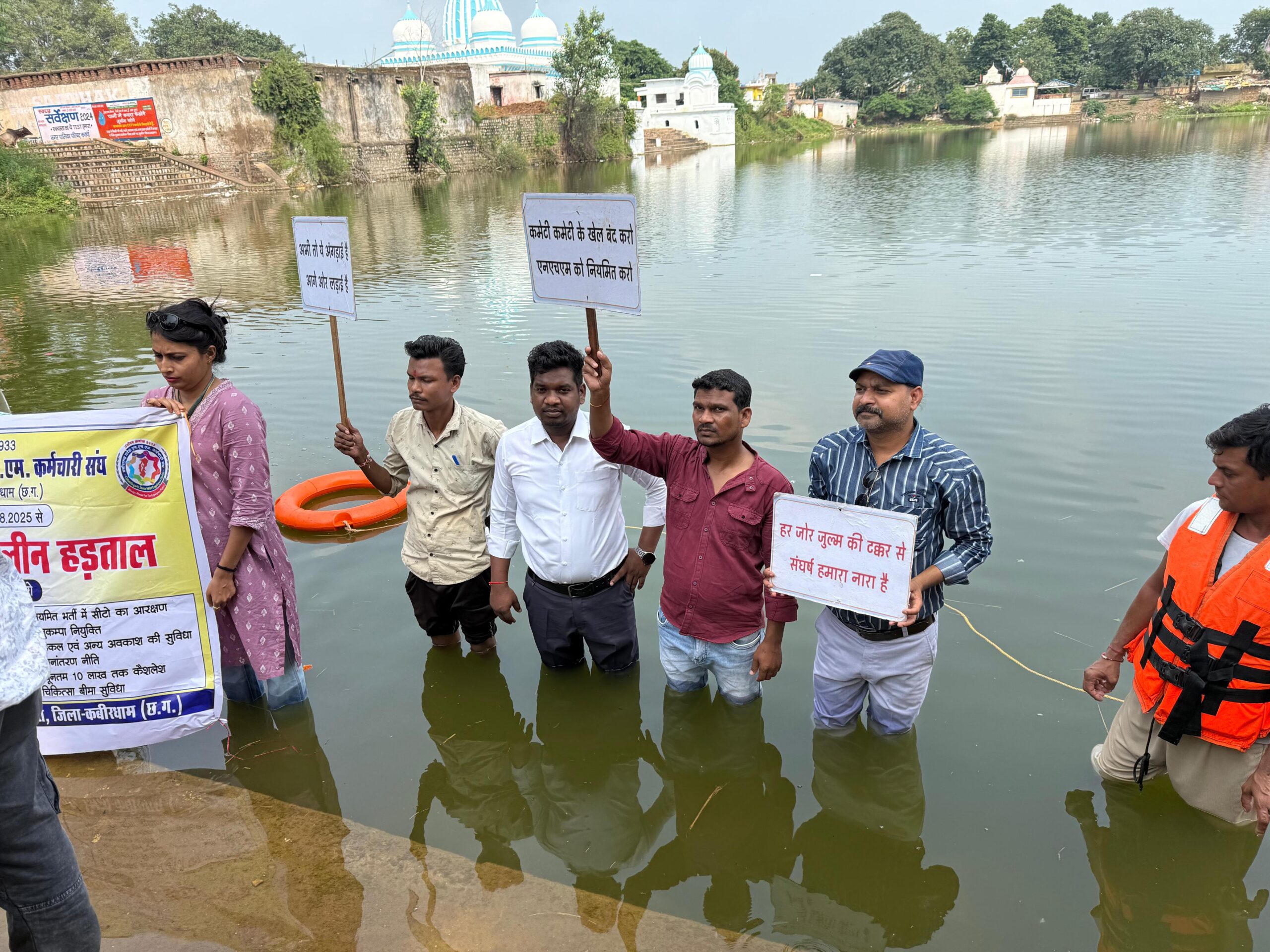कवर्धा: -नियमितीकरण, ग्रेड पे और 10 सूत्रीय मांगों को लेकर एनएचएम कर्मचारी पिछले 23 दिनों से अनिश्चितकालीन हड़ताल पर हैं। आज एनएचएम के लगभग 350 कर्मचारियों ने धरना स्थल पर सभा की पश्चात एक बड़ी रैली निकालकर कवर्धा शहर के राधा कृष्ण मंदिर स्थित तालाब में पहुँचकर जल सत्याग्रह किया और शासन-प्रशासन तक अपनी आवाज़ बुलंद की। आंदोलन के 23 वे दिन का अनोखा प्रदर्शन पूरे शहर में चर्चा का विषय बना रहा।