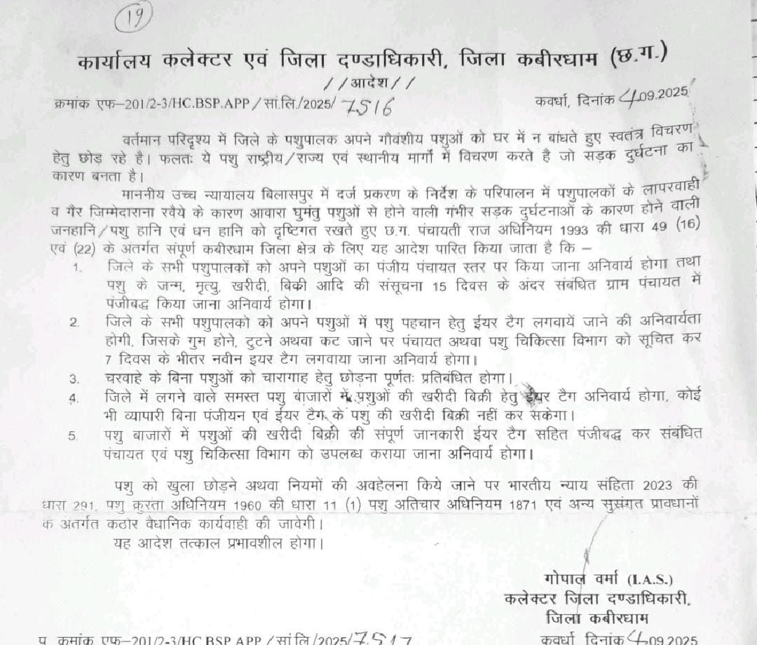 कवर्धा :- कबीरधाम जिले में सड़कों पर खुले में घूम रहे आवारा पशुओं से हो रही दुर्घटनाओं और जन-धन हानि को देखते हुए जिला प्रशासन ने सख्त कदम उठाए हैं। माननीय उच्च न्यायालय बिलासपुर में दर्ज प्रकरण के निर्देशों के परिपालन में कलेक्टर एवं जिला दण्डाधिकारी गोपाल वर्मा ने आदेश जारी करते हुए कहा है कि अब जिले के सभी पशुपालकों को अपने गौवंशीय पशुओं का पंचायत स्तर पर पंजीयन कराना अनिवार्य होगा। साथ ही पशुओं के जन्म, मृत्यु, खरीदी-बिक्री जैसी सूचनाएं 15 दिनों के भीतर संबंधित ग्राम पंचायत को देना अनिवार्य होगा।