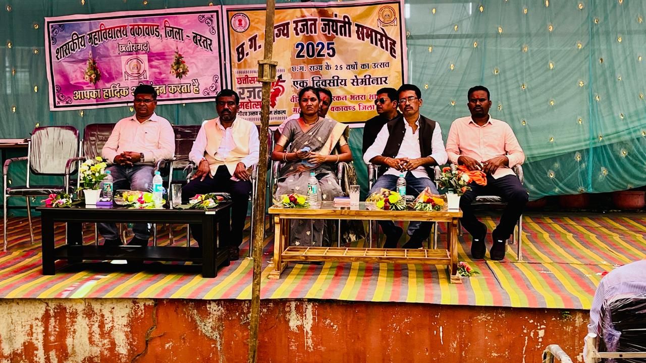 अतिथियों का स्वागत पुष्पगुच्छ और तिलक से हुआ। मुख्य अतिथि भद्रे ने विद्यार्थियों को संबोधित करते हुए कहा कि छत्तीसगढ़ की 25वीं वर्षगांठ हमारी मेहनत, संस्कृति और एकता की पहचान है। सपनों को पंख तभी लगते हैं जब मेहनत और अनुशासन से उन्हें उड़ान दी जाए। उन्होंने विद्यार्थियों से संकल्प लेने की अपील की कि आने वाले 25 वर्षों में छत्तीसगढ़ को शिक्षा, संस्कृति और प्रगति का आदर्श राज्य बनाएंगे। इस दौरान छात्रों ने जोशीले नारे लगाए पढ़ेगा युवा, बढ़ेगा बस्तर, छत्तीसगढ़, युवा बढ़ेंगे, बस्तर, छत्तीसगढ़ चढ़ेगा। विशिष्ट अतिथि पांडेय ने राज्य व बस्तर की उपलब्धियों पर प्रकाश डाला। वहीं प्राचार्य भावेश कुमार नेताम ने विद्यार्थियों को विकास यात्रा में सक्रिय योगदान देने के लिए प्रेरित किया। सहायक प्राध्यापिका मौसमी विश्वास ने विशेष वक्ता के रूप में अपने विचार साझा किए। इस अवसर पर 10 सितंबर को आयोजित क्विज, भाषण, वाद-विवाद एवं रंगोली प्रतियोगिता के विजेताओं को प्रमाण पत्र प्रदान कर सम्मानित किया गया। कार्यक्रम की अध्यक्षता प्राचार्य नेताम ने की, जबकि नोडल अधिकारी रूपकुमार साहू थे। मंच संचालन मोहन ध्रुव ने और आभार प्रदर्शन गोपीकृष्ण सिंह ने किया।समारोह में पिताम्बर कश्यप, जगन्नाथ सूर्यवंशी, रणवीर सिंह, मनोज बिसाई, कमल कश्यप सहित अनेक गणमान्यजन, महाविद्यालय का स्टाफ तथा बड़ी संख्या में छात्र-छात्राएं उपस्थित रहे।छत्तीसगढ़ राज्य रजत जयंती का यह समारोह न सिर्फ बकावंड बल्कि पूरे बस्तर के लिए गर्व का विषय है। विद्यार्थियों का जोश और संकल्प ही आने वाले कल का छत्तीसगढ़ गढ़ेगा।