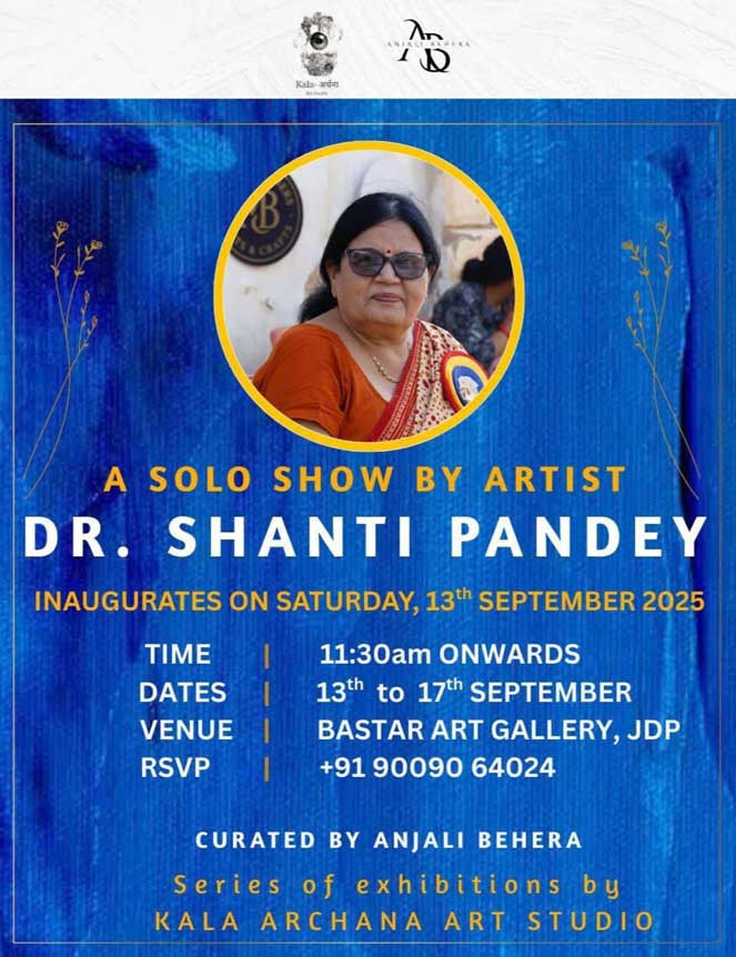 डॉ शांति पांडे स्त्रीरोग विशेषज्ञ के रूप में पूरे बस्तर संभाग के लिए एक जाना पहचाना नाम है, वे बस्तर जैसे आदिवासी क्षेत्र में आज भी सेवाएं दे रही हैं । एक डॅाक्टर के अंदर छिपी चित्रकला को उन्होंने सबके सम्मुख प्रस्तुत करने का निश्चय किया है। इसकी प्रस्तुति के लिए अंजलि बेहार सीरीज ऑफ एग्जीक्यूटिव एग्जीबिशन कला अर्चना स्टूडियो द्वारा प्रस्तुत किया जा रहा है।विदित हो कि डॉक्टर शांति पांडे बस्तर की जितनी कुशल स्त्री रोग चिकित्सक रही हैं, उतनी ही कुशल चितेरी भी हैं। चित्रकला के शौक ने उन्हें एक अच्छा खासा कलाकार बना दिया है। डॉ शांति पांडे से हुई चर्चा में उन्होंने बताया कि चित्रकला का उन्होंने कहीं से कोई ऐसा कोर्स नहीं किया है। अपने शौक के लिए चित्रों को अपनी कल्पना के अनुसार केनवास पर उकेरती रही हैं। इसी शौक के कारण आज उनके पास एक बड़ा कलेक्शन हो गया है, जिसे लोगों ने बस्तर आर्ट गैलरी में सभी के लिए प्रस्तुत करने के लिए प्रेरित किया, इस हेतु एक छोटा सा प्रयास है। उन्होंने बस्तर के कला प्रेमियों से आह्वान किया है कि वे 13 से 17 सितंबर तक संध्या 5 से रात्रि 9 बजे तक बस्तर आर्ट गैलरी में पहुंचकर अपना आशीर्वाद प्रदान करें।
