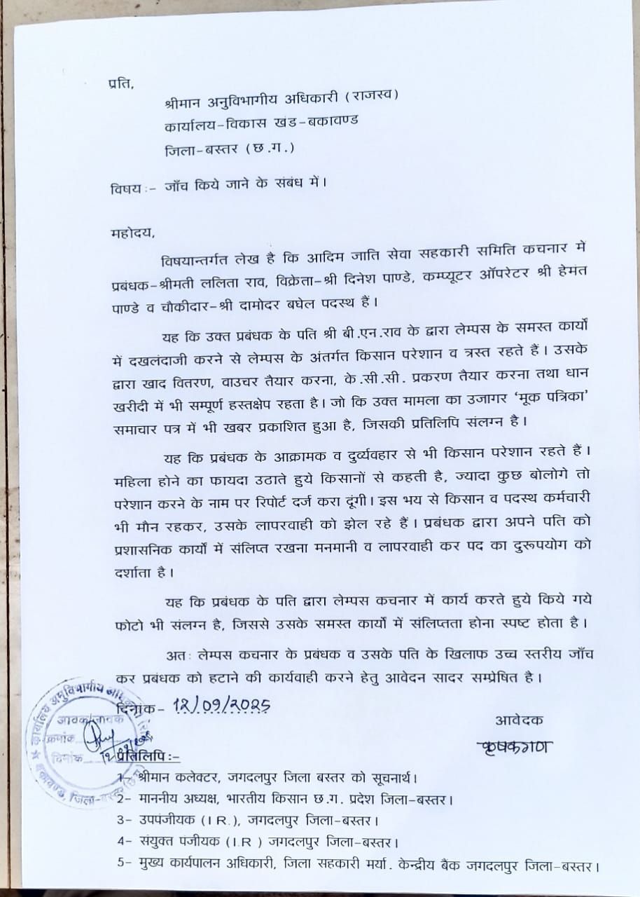 ग्रामीणों ने शिकायत में बताया है कि आदिम जाति सेवा सहकारी समिति कचनार में प्रबंधक ललिता राव, विक्रेता दिनेश पाण्डे, कम्प्यूटर ऑपरेटर हेमंत पाण्डे और चौकीदार दामोदर बघेल पदस्थ हैं। प्रबंधक ललिता राव के पति बी. एन. राव द्वारा सोसायटी के समस्त कार्यों में दखलंदाजी करने से लेंपस के अंतर्गत आने वाले किसान परेशान व त्रस्त हैं। प्रबंधक के पति का खाद वितरण, वाउचर तैयार करने, के.सी.सी. प्रकरण तैयार करनाे तथा धान खरीदी में भी पूरा हस्तक्षेप रहता है। प्रबंधक के आक्रामक रवैए व दुर्व्यवहार से भी किसान परेशान रहते हैं। महिला होने का फायदा उठाते हुए वे किसानों से कहती हैं कि, lज्यादा कुछ बोलोगे तो परेशान करने के नाम पर रिपोर्ट दर्ज करा दूंगी। इस भय से किसान व पदस्थ कर्मचारी भी मौन रहकर उनकी लापरवाही को झेल रहे हैं। प्रबंधक द्वारा अपने पति को विभागीय कार्यों में संलिप्त रखना, मनमानी व लापरवाही और पद के दुरूपयोग को दर्शाता है। प्रबंधक के पति की लेंपस कचनार में कार्य करते फोटो भी शिकायत के साथ सबूत के तौर पर प्रस्तुत की गई है। लेंपस सोसायटी कचनार के प्रबंधक व उसके पति के खिलाफ उच्च स्तरीय जांच कर प्रबंधक को हटाने की मांग की गई है। मामले की शिकायत अनुविभागीय अधिकारी (राजस्व) बकावंड, अध्यक्ष, भारतीय किसान कल्याण संघ छग, उप पंजीयक जगदलपुर, संयुक्त पंजीयक जगदलपुर बस्तर और मुख्य कार्यपालन अधिकारी जिला सहकारी मर्या केंद्रीय बैंक जगदलपुर से भी की गई है।