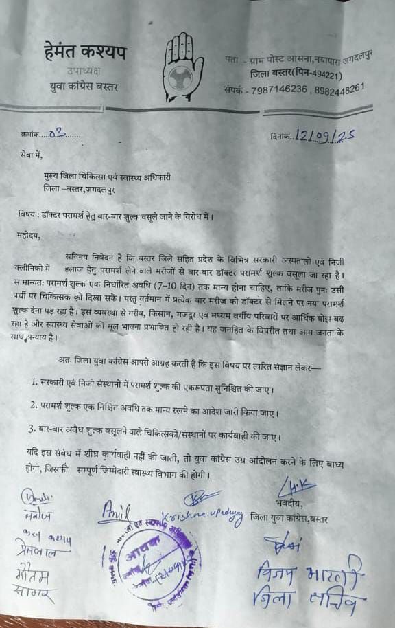 बस्तर जिले सहित प्रदेश के विभिन्न प्राइवेट अस्पतालों एवं निजी क्लीनिकों में मरीजों से हर बार नया परामर्श शुल्क लिया जा रहा है, जबकि सामान्यत: परामर्श शुल्क 7–10 दिनों तक मान्य होना चाहिए। यह अव्यवस्था गरीब, किसान, मजदूर और मध्यमवर्गीय परिवारों पर अतिरिक्त आर्थिक बोझ डाल रही है तथा स्वास्थ्य सेवाओं की मूल भावना के विपरीत है।