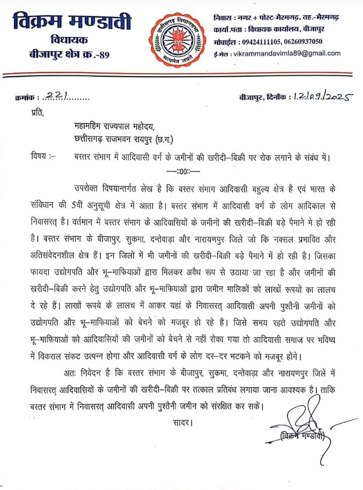 बीजापुर विधायक विक्रम मंडावी ने राज्यपाल को पत्र के माध्यम से अवगत कराया है कि बस्तर संभाग आदिवासी बाहुल्य क्षेत्र है और 5वीं अनुसूची में आता है, बस्तर संभाग में आदिवासी वर्ग के लोग आदिकाल से निवासरत हैं। वर्तमान में आदिवासियों के जमीनों कि खरीदी बिक्री बड़े पैमाने पर हो रही है। बस्तर संभाग के बीजापुर, सुकमा, दंतेवाड़ा और नारायणपुर जिले नक्सल प्रभावित और अति संवेदनशील क्षेत्र हैं। इन जिलों में भूमाफिया उद्योगपति बड़े स्तर पर पैसे का लालच देकर आदिवासियों की जमीनों की खरीदी बिक्री कर लाभ उठाने का प्रयास कर रहे हैं। वहीं पैसों के लालच में आकर स्थानीय आदिवासी अपनी पुश्तैनी जमीनों को भूमाफियों को बेचने के लिए मजबूर हो रहे हैं। यदि समय रहते उद्योगपति भूमाफियाओं को आदिवासियों की जमीन बिक्री करने से नही रोका गया तो आदिवासी समाज के लिए भविष्य में विकराल संकट उत्पन्न होगा और उन्हें दर दर भटकने के लिए मजबूर होना पड़ेगा। इस कारण बीजापुर, सुकमा, दंतेवाड़ा और नारायणपुर जिलों में आदिवासियों की जमीन की खरीदी बिक्री पर रोक लगाना आवश्यक है।