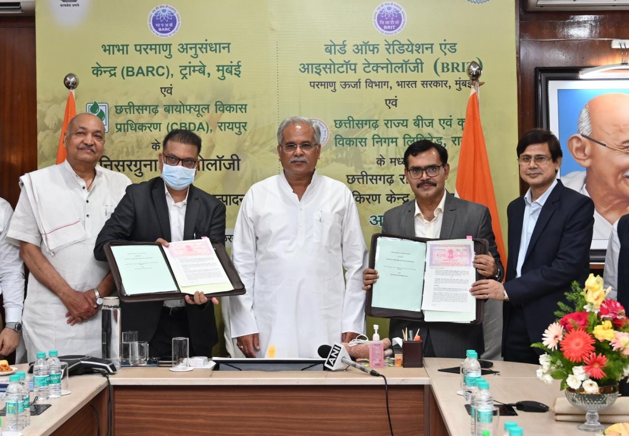 फ़ूड इरेडिएटर प्लांट के संचालन एवं तकनीक हस्तांतरण को लेकर छत्तीसगढ़ शासन की ओर से बीज निगम एवं परमाणु ऊर्जा विभाग के अंतर्गत कार्यरत विकिरण बोर्ड एवं आइसोटोप प्रौद्योगिकी के मध्य हुआ एमओयू, भाभा एटॉमिक रिसर्च सेंटर छत्तीसगढ़ राज्य को गौठानों में गोबर से बिजली बनाने के लिए देगा तकनीकी मार्गदर्शन