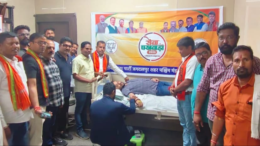 जगदलपुर।भारतीय जनता पार्टी द्वारा मनाये जा रहे सेवा पखवाड़ा कार्यक्रम के तहत आज शनिवार को भाजपा जगदलपुर पश्चिम मण्डल ने महारानी जिला अस्पताल में रक्तदान शिविर का आयोजन किया गया। जिसमें जगदलपुर पश्चिम मण्डल अध्यक्ष प्रकाश झा सहित 13 लोगों ने रक्तदान किया।