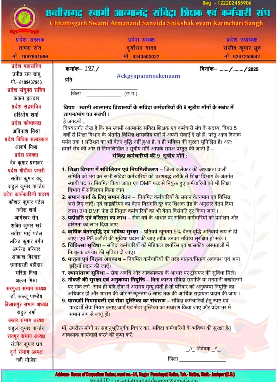 स्वामी आत्मानंद संविदा शिक्षक एवं कर्मचारी संघ ने नवरात्रि के पावन अवसर पर अपनी मांगों का ज्ञापन देवी मां के चरणों में समर्पित कर एक अनोखी पहल की है। संघ ने इस अभियान को नाम दिया है – “एक ज्ञापन मां के नाम”।अष्टमी और नवमी के दिन प्रदेशभर के देवी मंदिरों में संघ के पदाधिकारियों एवं सदस्यों ने सामूहिक रूप से मां दुर्गा को अपनी नौ सूत्रीय मांगें अर्पित कीं और प्रदेश सरकार से इन्हें शीघ्र लागू कराने की अपील की।कार्यक्रम संघ के मार्गदर्शक व संरक्षक तापस राय, महिला उपाध्यक्ष हिमांगिनी पांडे के मार्गदर्शन तथा संयुक्त सचिव हरिओम शर्मा की अध्यक्षता में छत्तीसगढ़ राज्य के विभिन्न जिलों में संपन्न हुआ। संघ की प्रमुख 9 मांगें इस प्रकार हैं- शिक्षा विभाग में संविलियन एवं नियमितीकरण, समान कार्य के लिए समान वेतन, पुरानी पेंशन योजना की बहाली, चिकित्सा सुविधा एवं स्वास्थ्य बीमा, वार्षिक वेतनवृद्धि एवं सेवा सुरक्षा, महिला कर्मचारियों हेतु प्रसूति अवकाश व सुरक्षा प्रावधान, नियुक्ति प्रक्रिया में पारदर्शिता, पदोन्नति का अधिकार और कार्यभार एवं दायित्व के अनुरूप उचित मानदेय। संघ ने कहा है कि आत्मानंद विद्यालयों के संविदा शिक्षक और कर्मचारी प्रदेश की शिक्षा व्यवस्था की रीढ़ हैं, लेकिन आज भी उन्हें स्थायित्व और सुरक्षा नहीं मिल पाई है। नवरात्रि के पावन पर्व पर मां दुर्गा से प्रार्थना की गई कि शासन-प्रशासन उनकी इन न्यायोचित मांगों पर संवेदनशील निर्णय ले। संघ के पदाधिकारियों ने भावुक अपील करते हुए कहा हमारी मांगें केवल सरकार को ही नहीं, बल्कि माता के चरणों में भी अर्पित हैं। ‘एक ज्ञापन मां के नाम’ हमारी आस्था और विश्वास का प्रतीक है। अब न्याय और सम्मान की उम्मीद के साथ पूरा प्रदेश संघ के साथ खड़ा है।