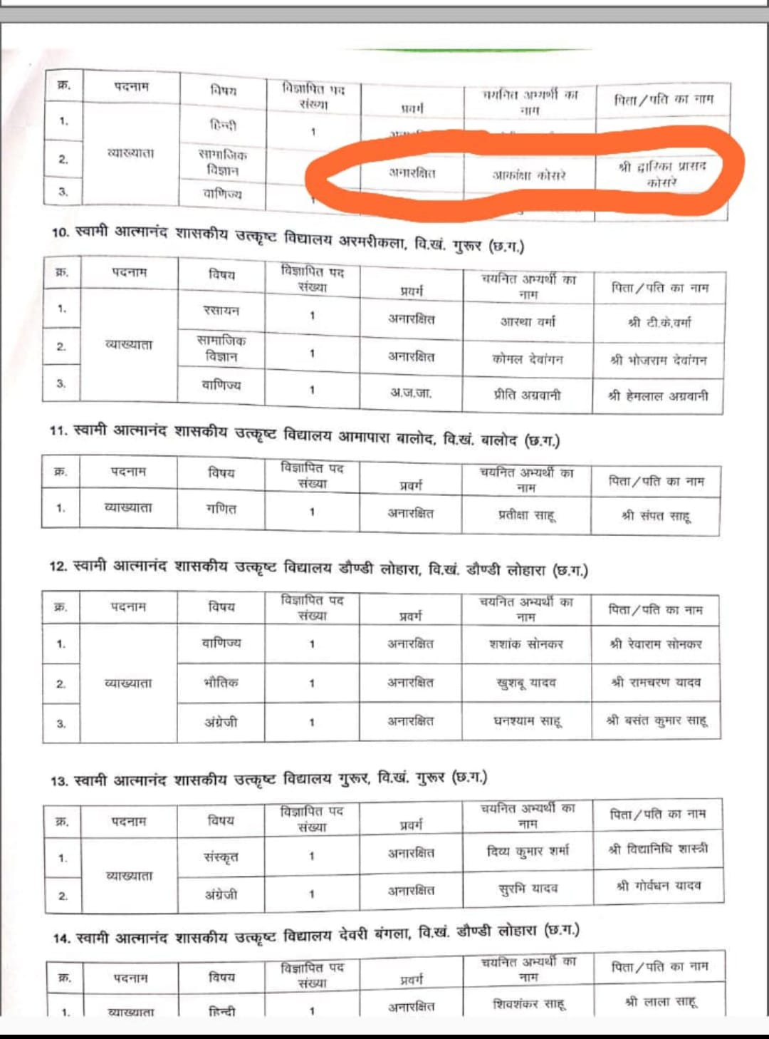 मामले में सबसे गंभीर आरोप चयन समिति के नोडल अधिकारी डीपी कोसरे पर लगे हैं, जिन्होंने अपनी ही पुत्री की नियुक्ति स्वामी आत्मानंद विद्यालय, घोठिया में व्याख्याता पद पर करवा दी ई है। उन्होंने नियमों की अनदेखी करते हुए अपनी ही पुत्री आकांशा कोसरे को व्याख्याता (सामाजिक विज्ञान) पद पर घोठिया आत्मानंद विद्यालय में नियुक्त करवा दिया है।मामला और गंभीर तब हो जाता है जब यह तथ्य सामने आता है कि कोसरे आरक्षित वर्ग से संबंधित हैं, मगर उनकी बेटी की अनारक्षित वर्ग की श्रेणी में नियुक्त किया गया है। जिससे प्रक्रिया में धांधली की आशंका और गहरी हो जाती है। जबकि शिक्षा विभाग के नियमों के अनुसार, चयन समिति के किसी भी सदस्य के परिवारजन को भर्ती प्रक्रिया में शामिल नहीं किया जा सकता। और यदि ऐसा कोई संबंध है तो उसे पूर्व में शपथ पत्र देकर सूचना देना अनिवार्य होता है लेकिन डीपी कोसरे द्वारा ना तो ऐसी कोई सूचना दी गई न ही स्वयं को प्रक्रिया से अलग किया गया। जिससे यह संदेह मजबूत होता है कि नियोजन पूर्व नियोजित तरीके से हुआ। यह चयन प्रक्रिया की निष्पक्षता और पारदर्शिता पर सीधा प्रहार माना जा रहा है।